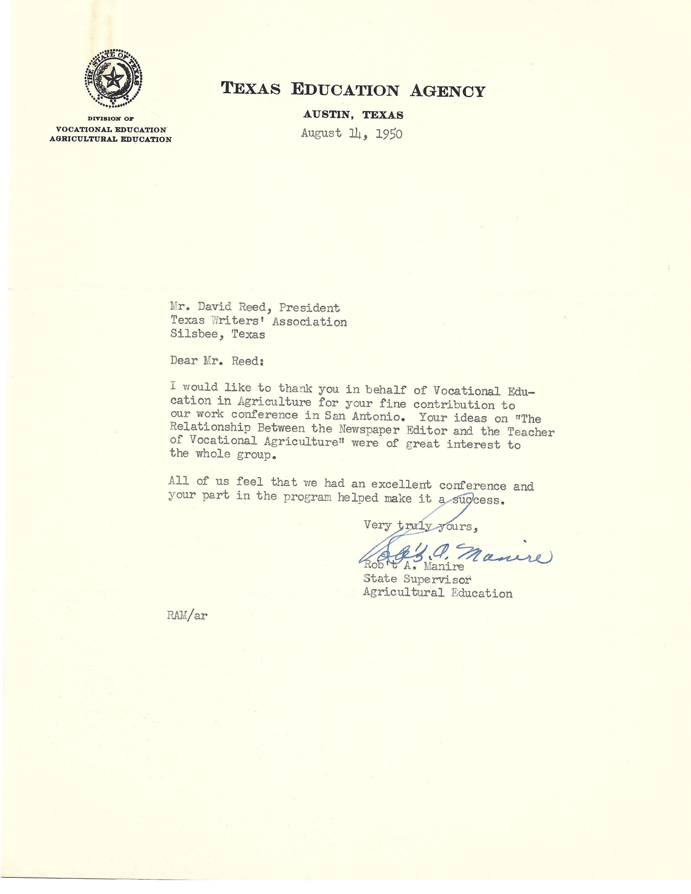 Letter to David Read from Robert A Manire August 11, 1950Tags