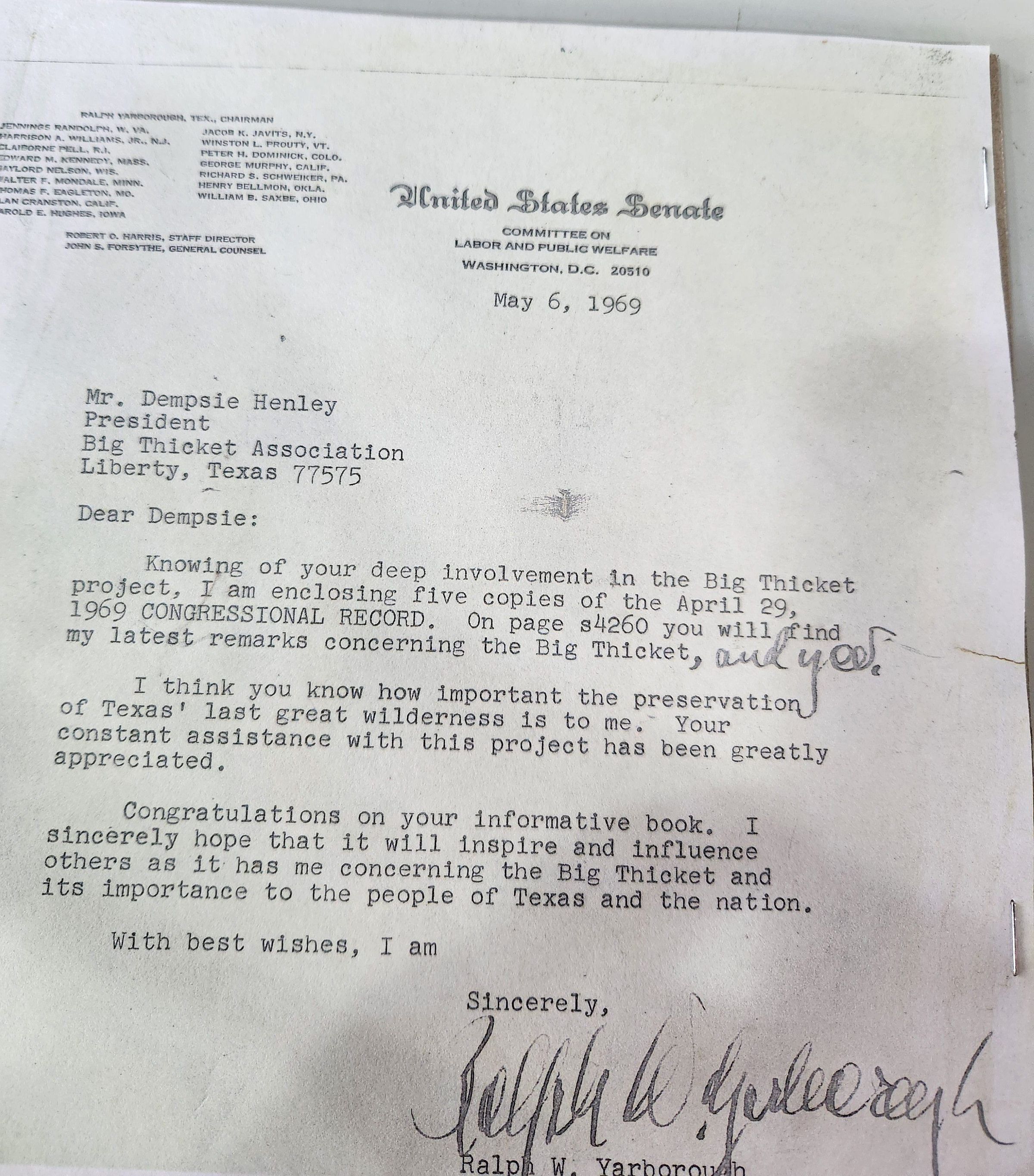 US Senate, Henley, Dempsie, Yarborough, Ralph W, Big Thicket, Congressional RecordScope and Content