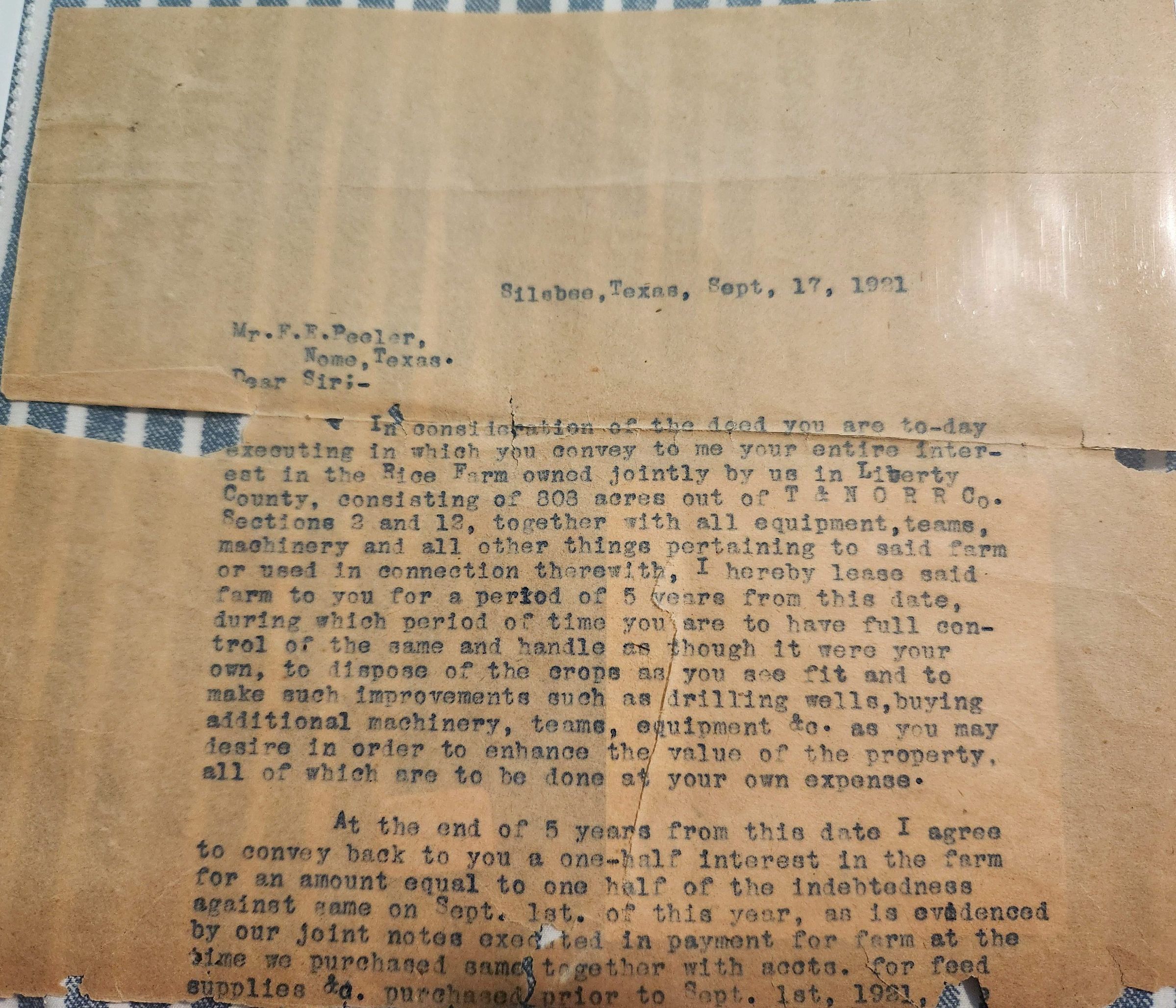 Letter to F E Peeler of Nome Texas from R L Weathersby dated September 17, 1931 concerning Rice FarmTags