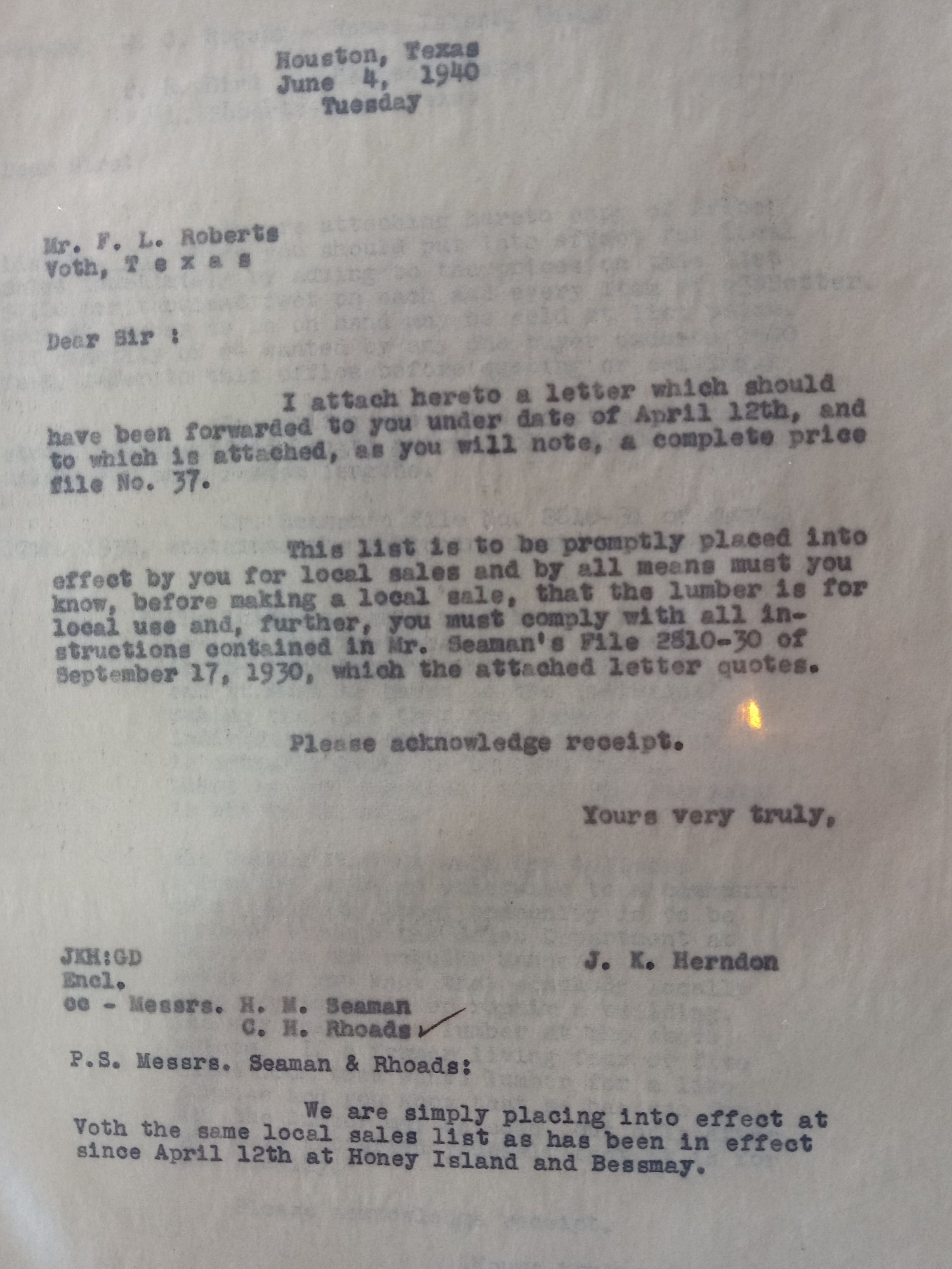 Letter to F L Roberts from J K Herndon dated June 4, 1940 - price changes for lumberTags