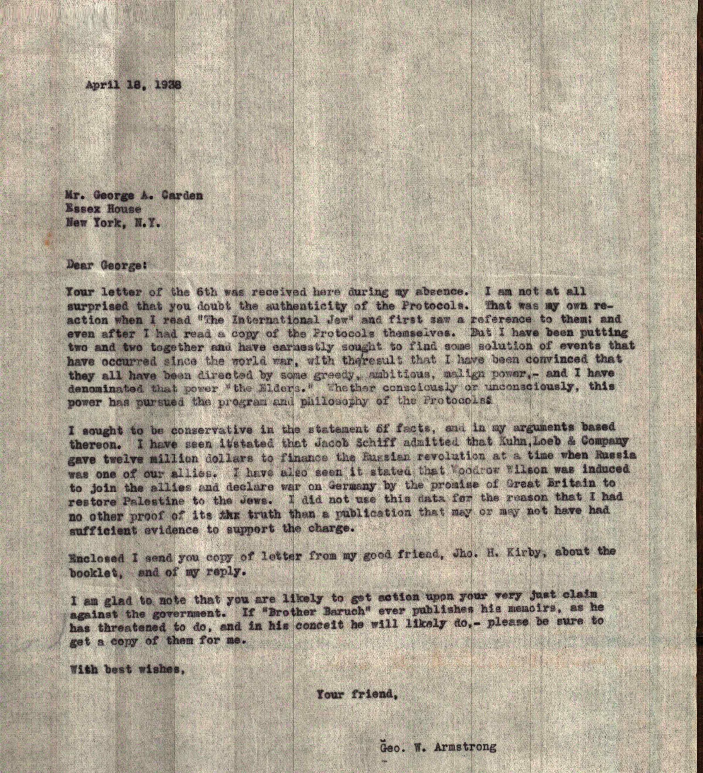Letter to George A Garden from George W Armstrong dated April 18,1938Tags