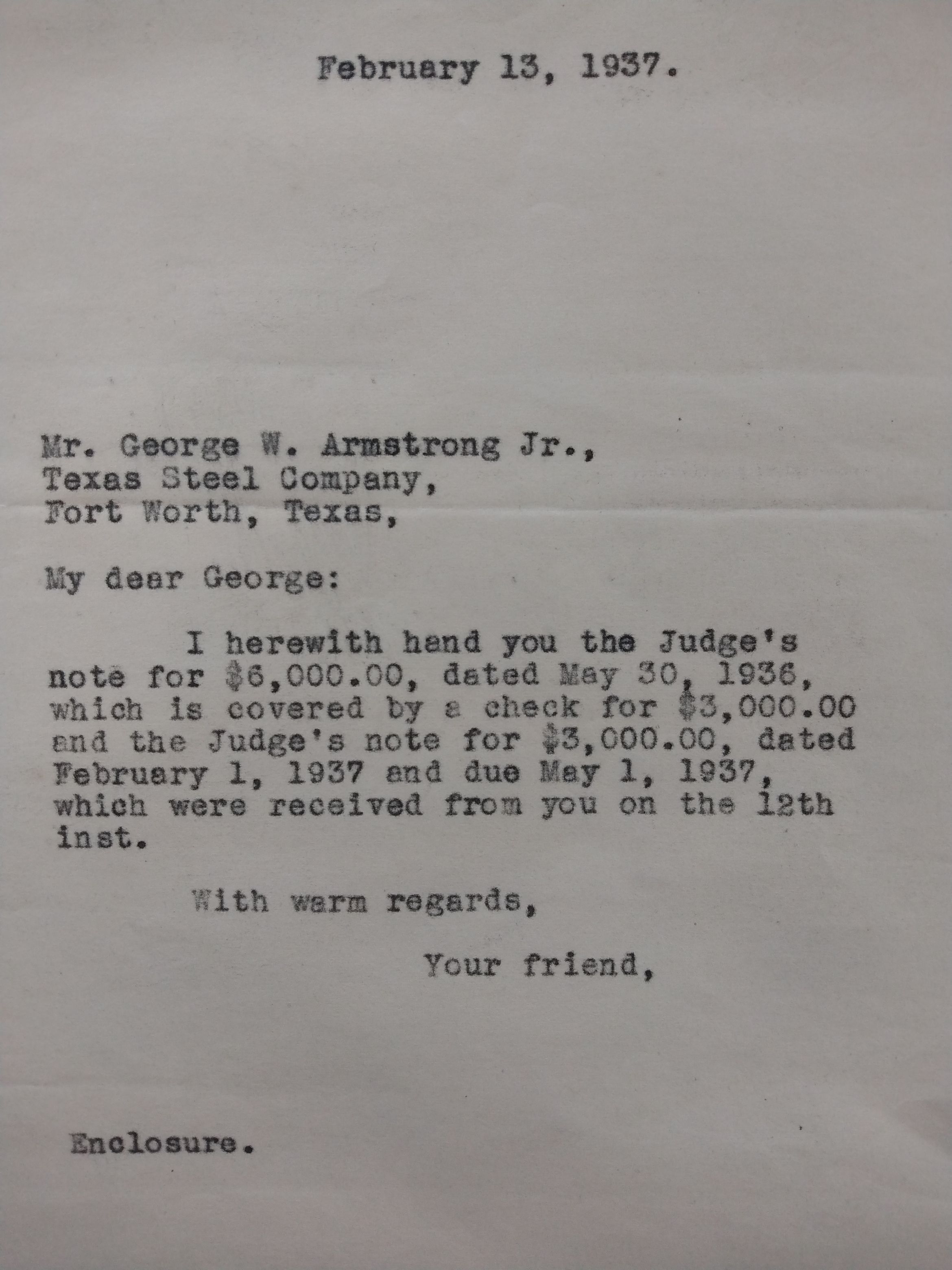 Letter to George Armstrong from John Henry Kirby February 13,1937Tags