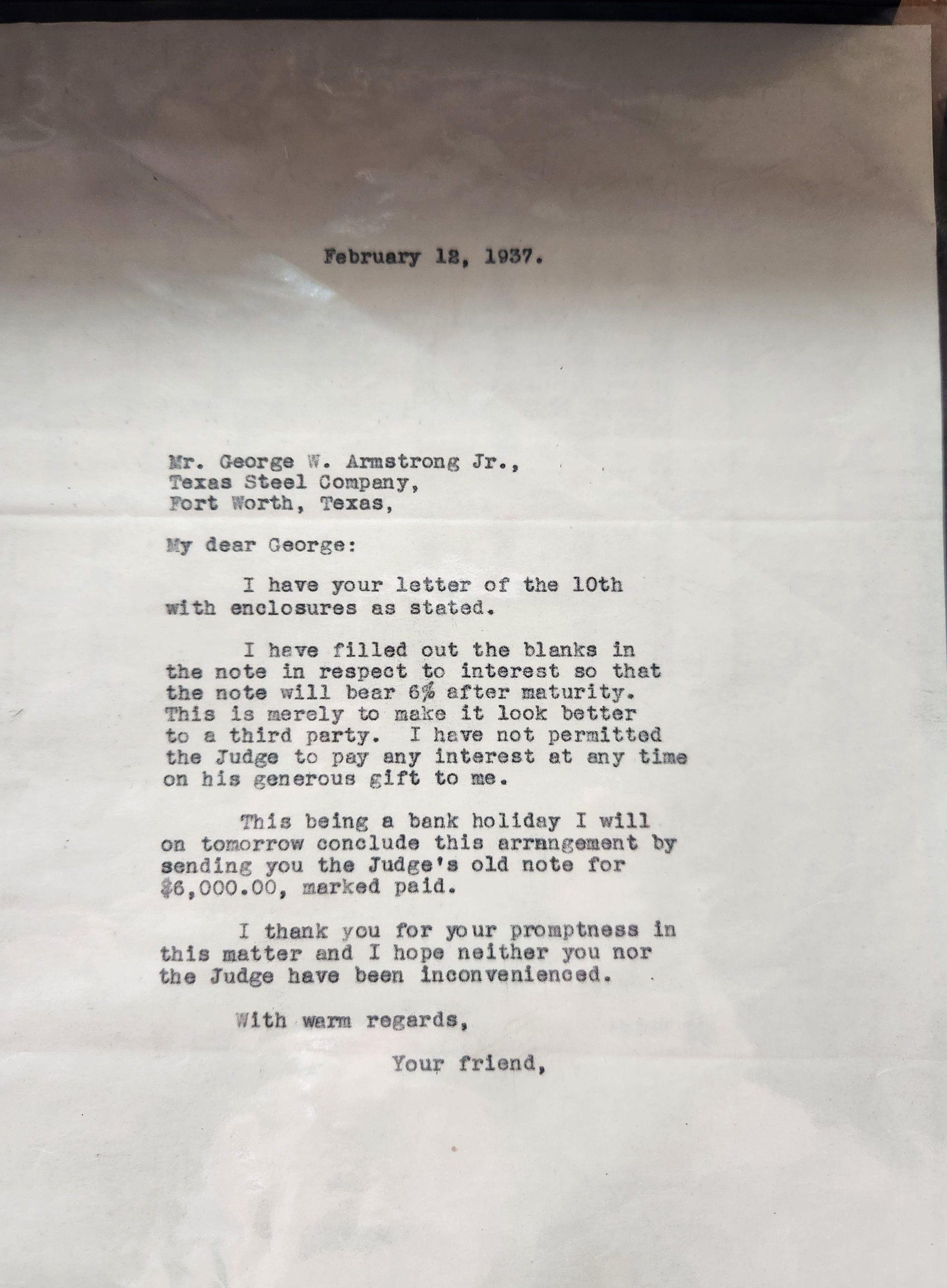 Letter to George W Armstrong from John Henry Kirby February 12, 1937Tags