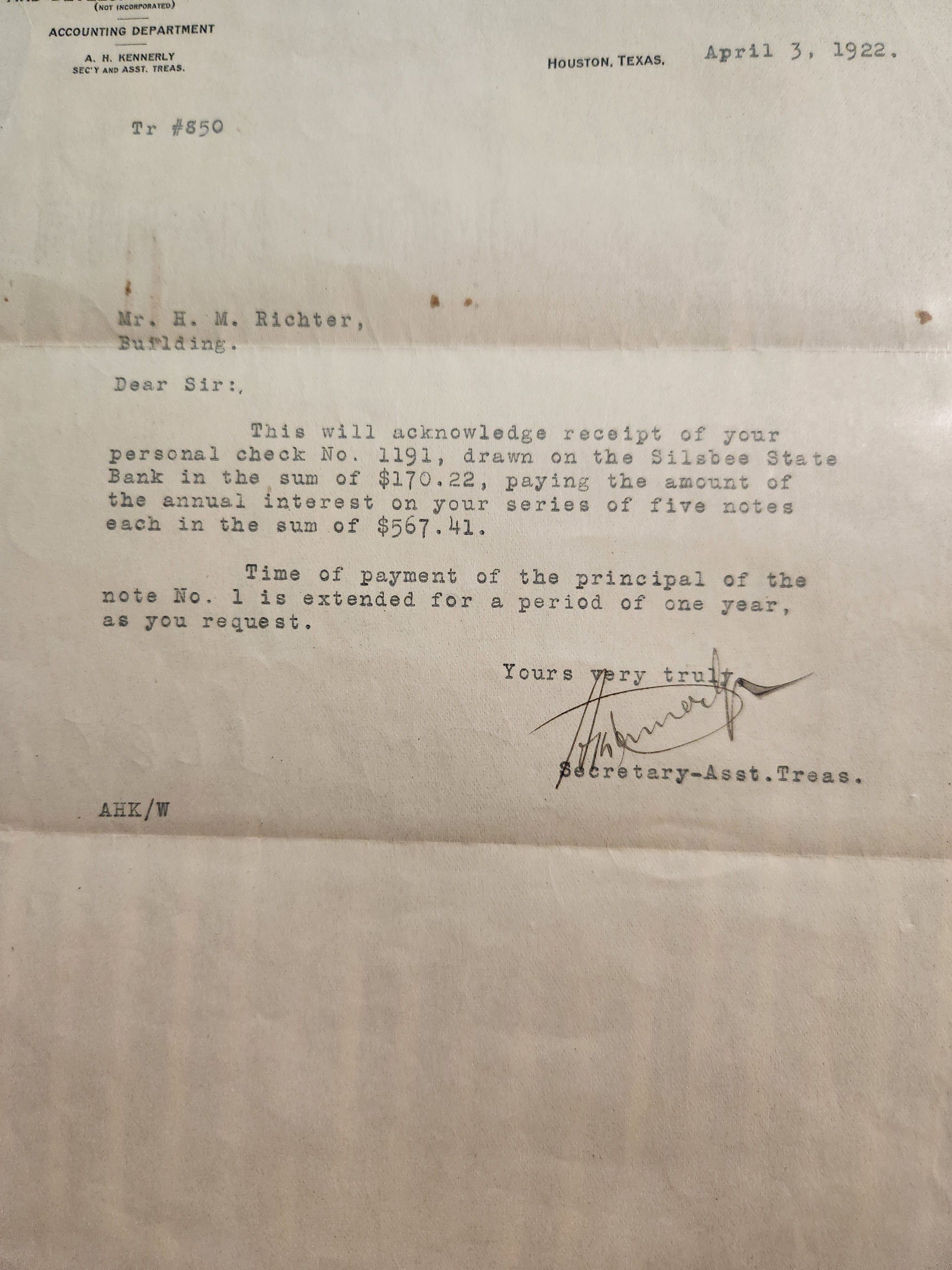 Letter to H M Richter from Southwestern Settlement & Deveopment - receipt for check paying annual interst on 5 notes dated April 4, 1922Tags