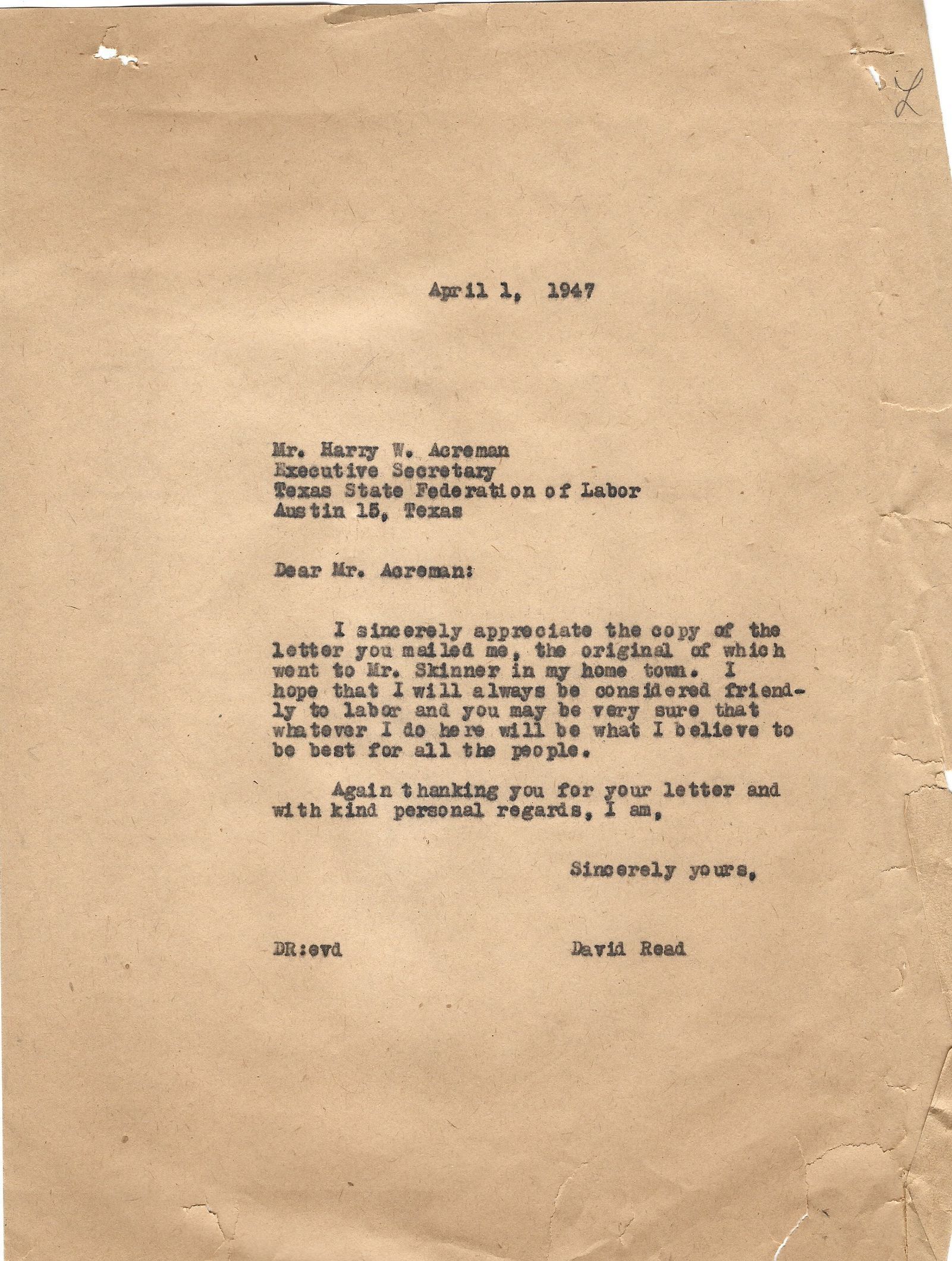 David Read, Texas House of Representatives, Texas State Federation of Labor, Voting, Harry Acreman, E C SkinnerCreated By