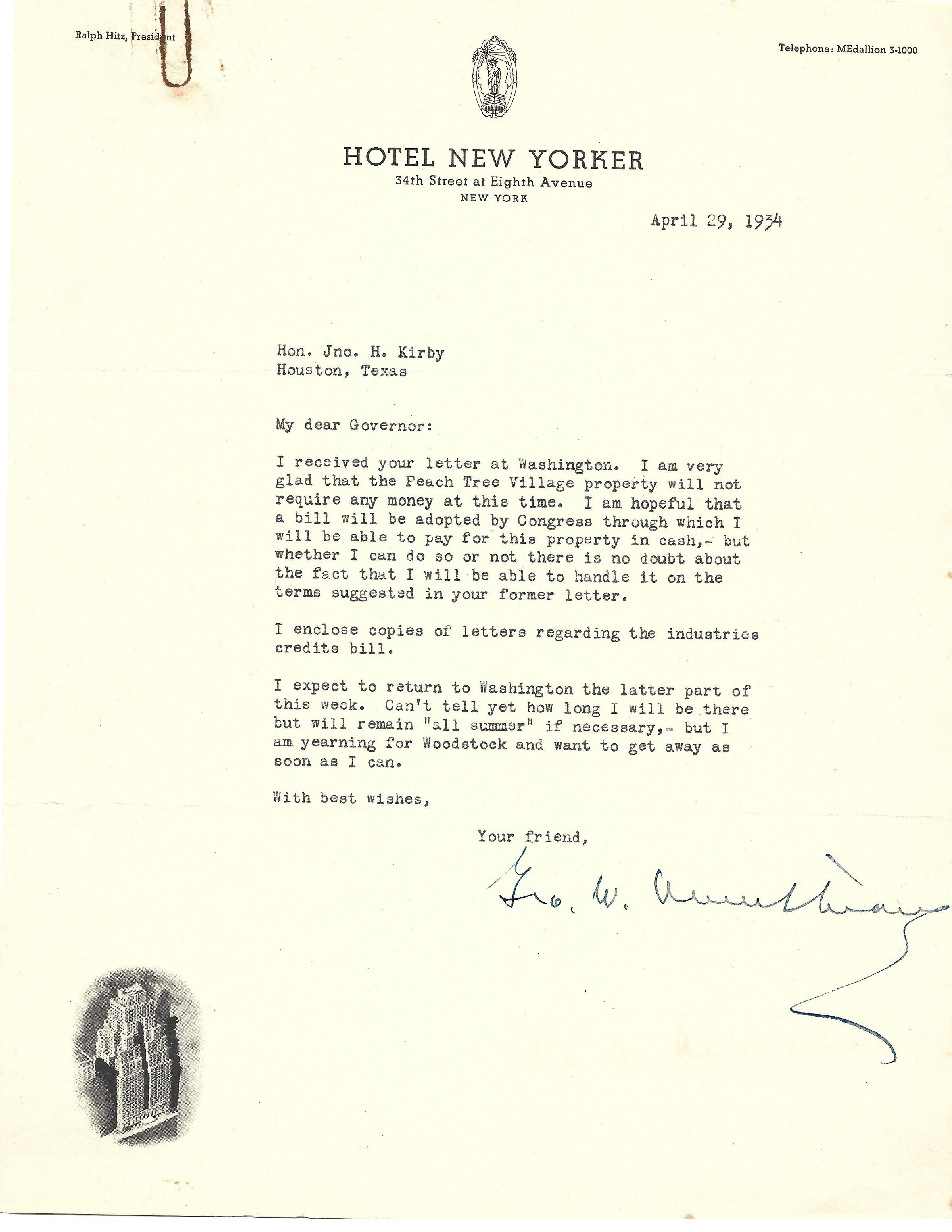 Letter to John H Kirby from George W Armstrong dated April 29, 1934Tags