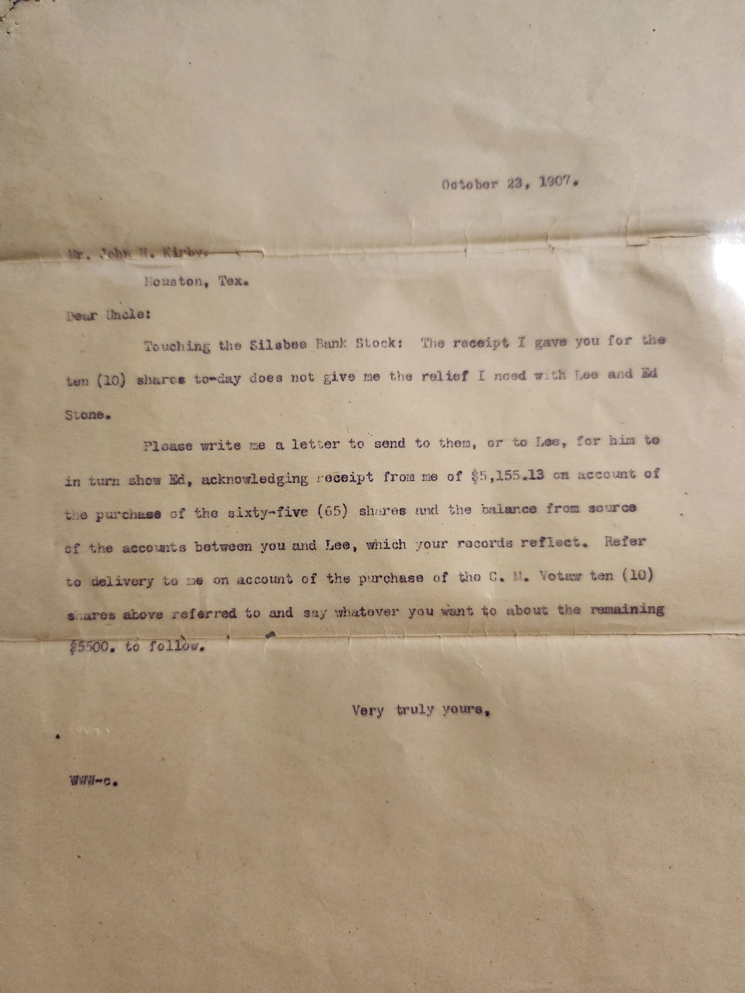 Letter to John H Kirby from Nephew dated October 23, 1907 concerning Silsbee Bank StockTags