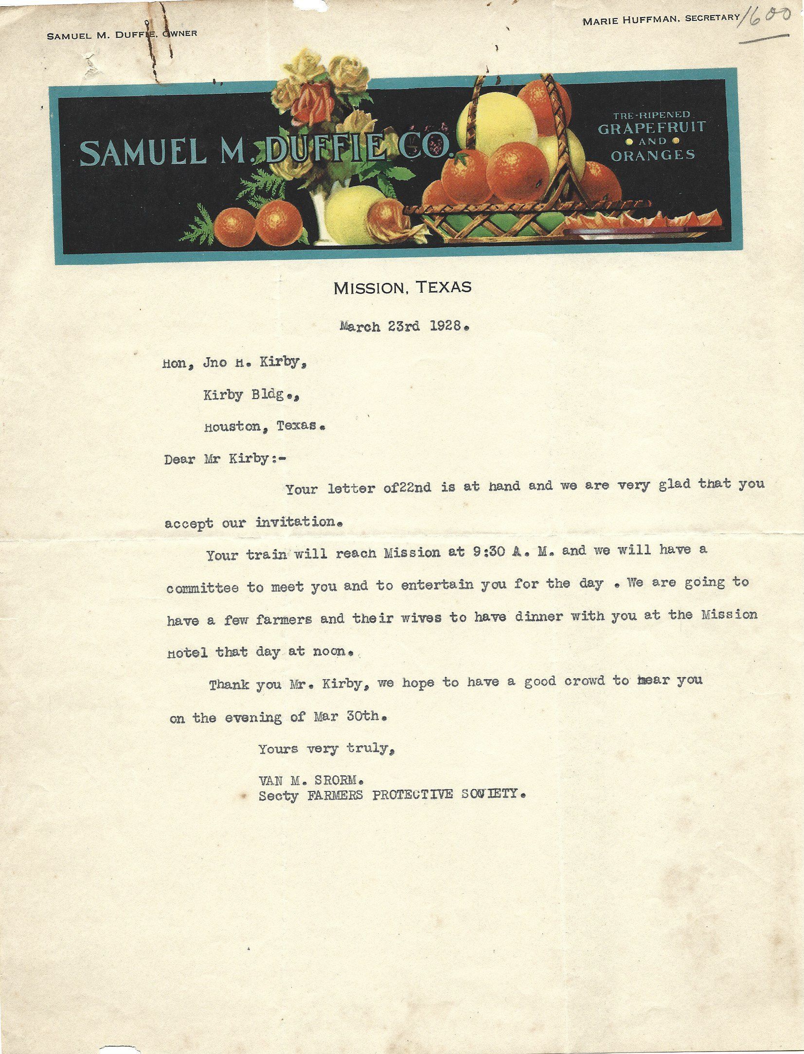 Letter to John H Kirby from Van Srorm inviting Kirby to speak at the Farmers Protective Society/ New Paper ArticleTags