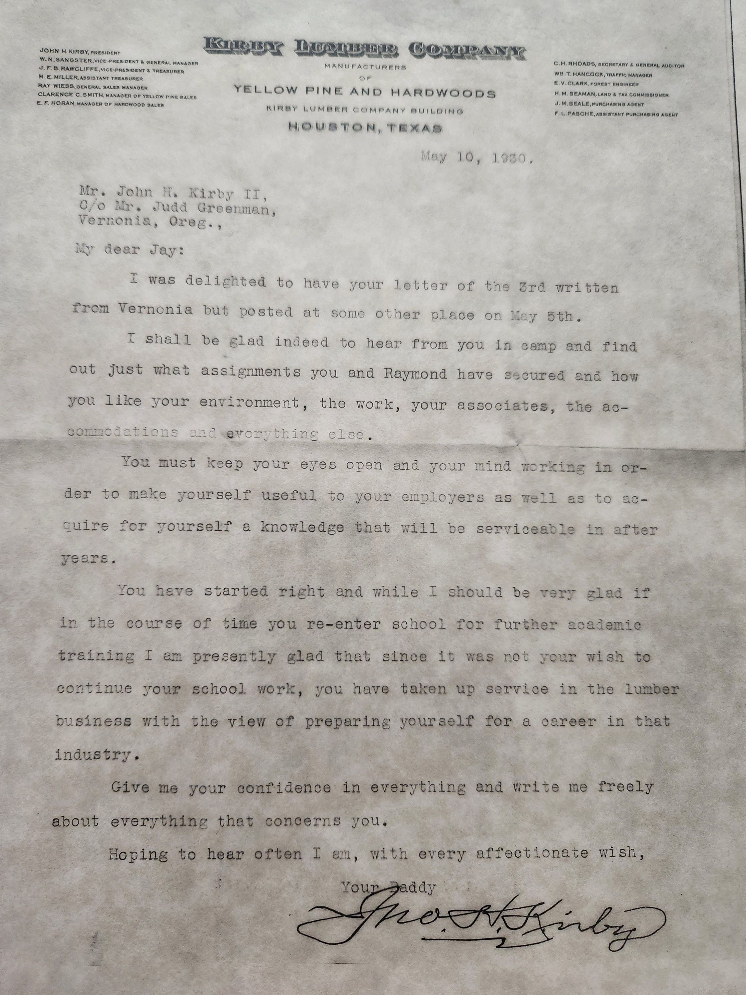 Letter to John H Kirby II (Jay) from John Henry Kirby dated May 10, 1930Tags