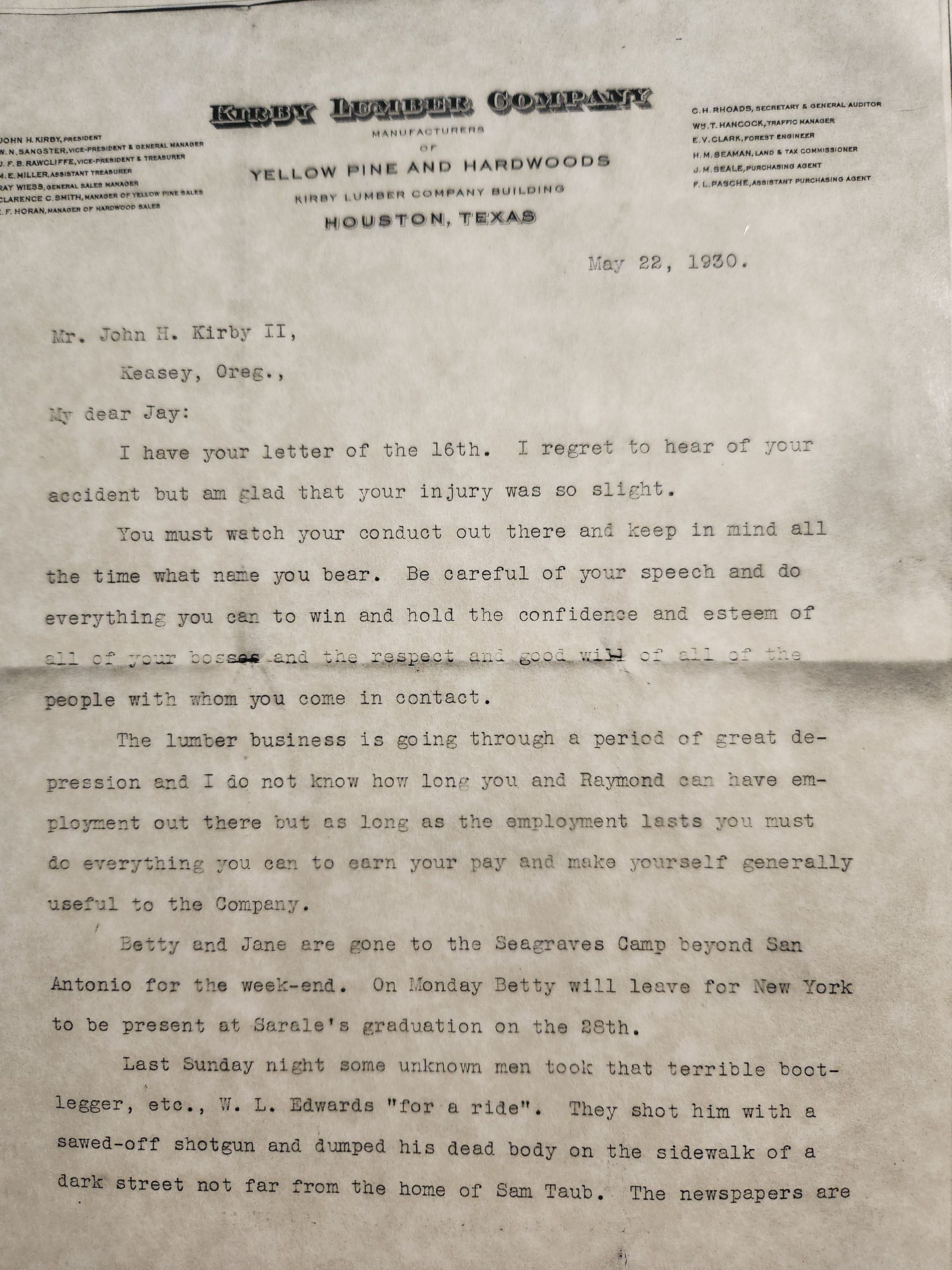 Letter to John H Kirby II (Jay) from John Henry Kirby dated May 22, 1930
