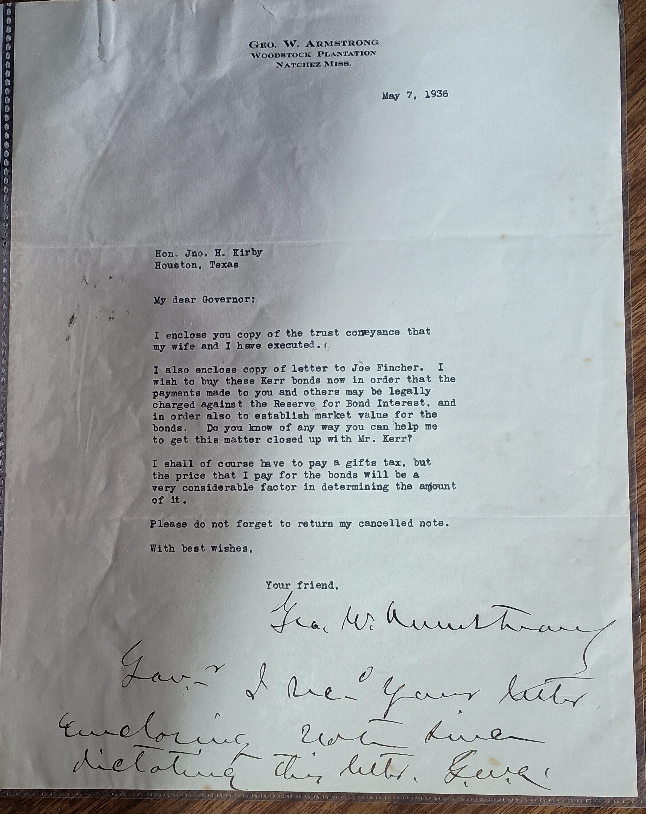 Letter to John Henry Kirby dated May 7, 1936 from George W. Armstrong, Woodstock Plantation, Natchez, Mississippi discussing Kerr bondsTags