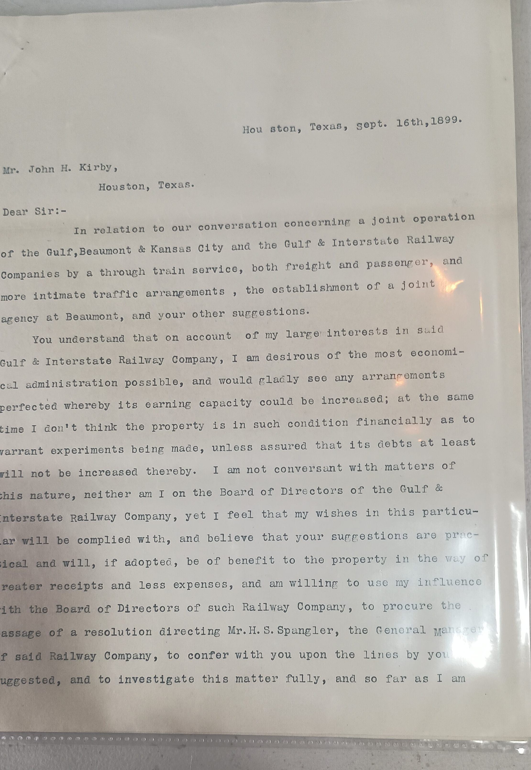Letter to John Henry Kirby dated September 16, 1899 from A.H. Pierce regarding a joint operation of the Gulf, Beaumont, & Kansas City and Gulf & Interstate Railway CompaniesTags
