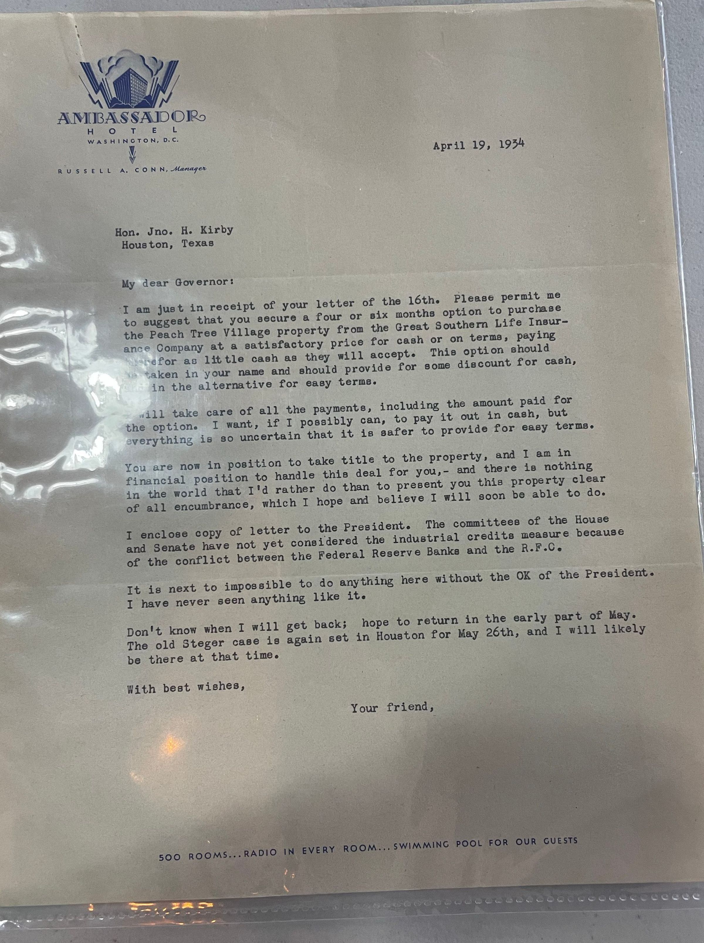Letter to John Henry Kirby from Ambassador Hotel 4/19/1934Tags