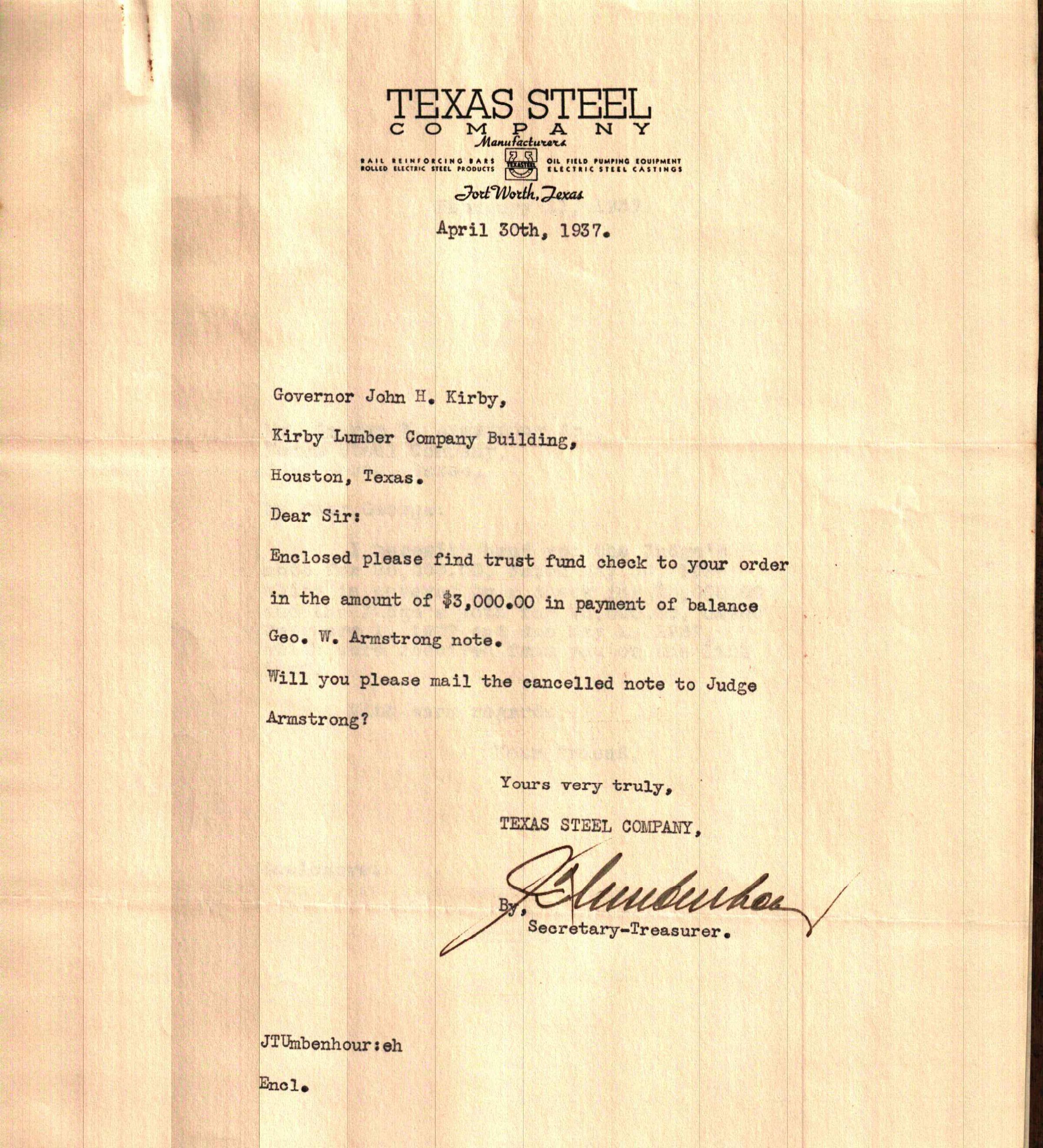 Letter to John Henry Kirby from Texas Steel Company April 30, 1937Tags