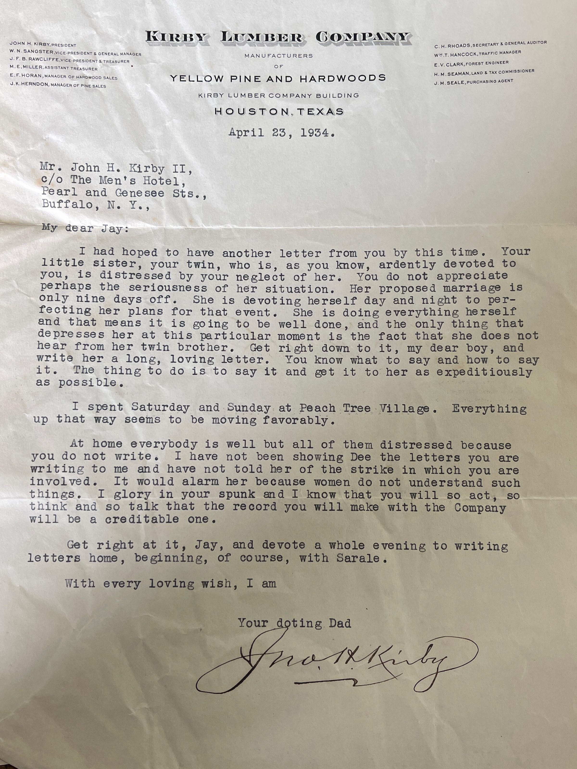 Letter to John Henry Kirby II (Jay) from John Henry Kirby dated April 23, 1934Tags