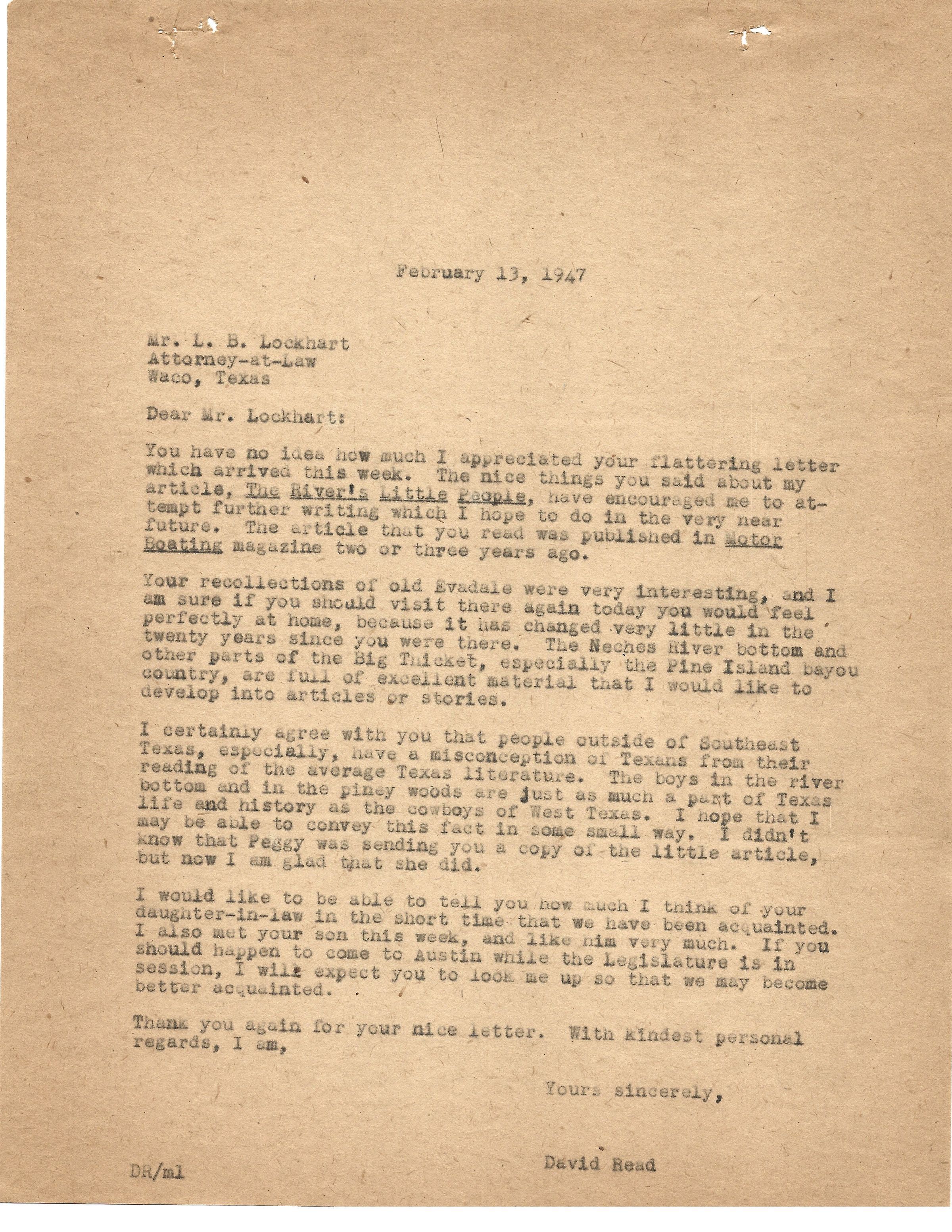 Letter to L B Lockhart from David Read February 13, 1947Tags