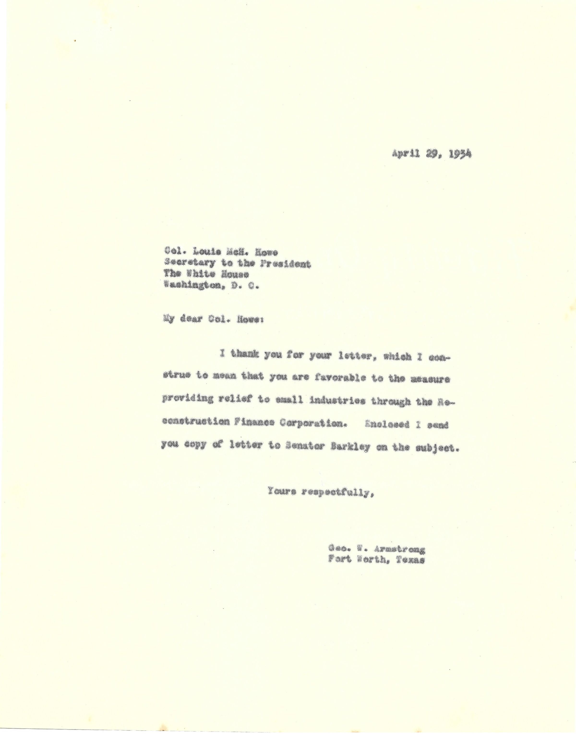 Letter to Louis Howe from George W Armstrong dated April 29, 1934Tags