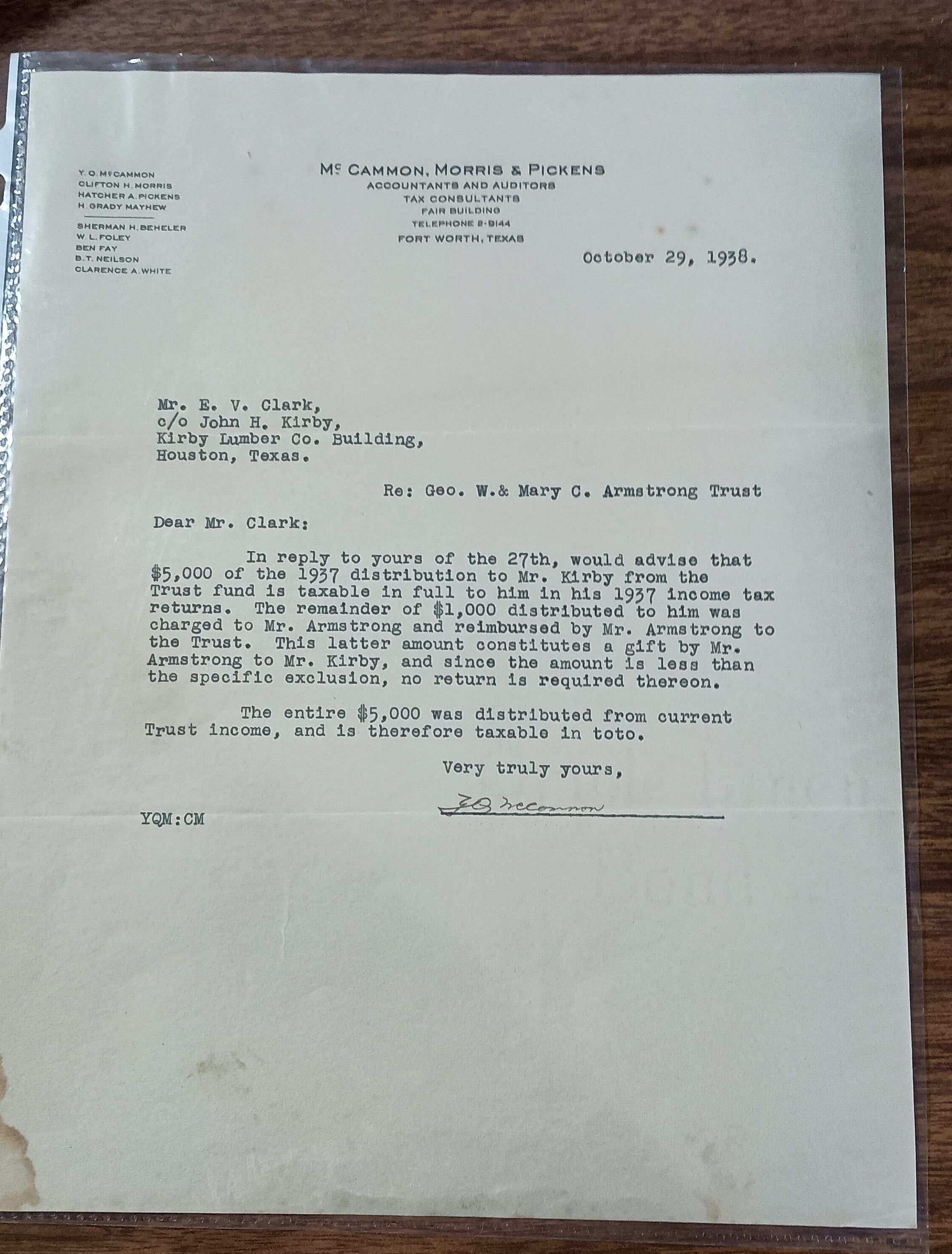 Letter to Mr. E. V. Clark c/o John H. Kirby dated October 29, 1938 from McCammon at McCammon, Morris & Pickens discussing 1937 distribution to Mr. Kirby and gift from Mr. ArmstrongTags