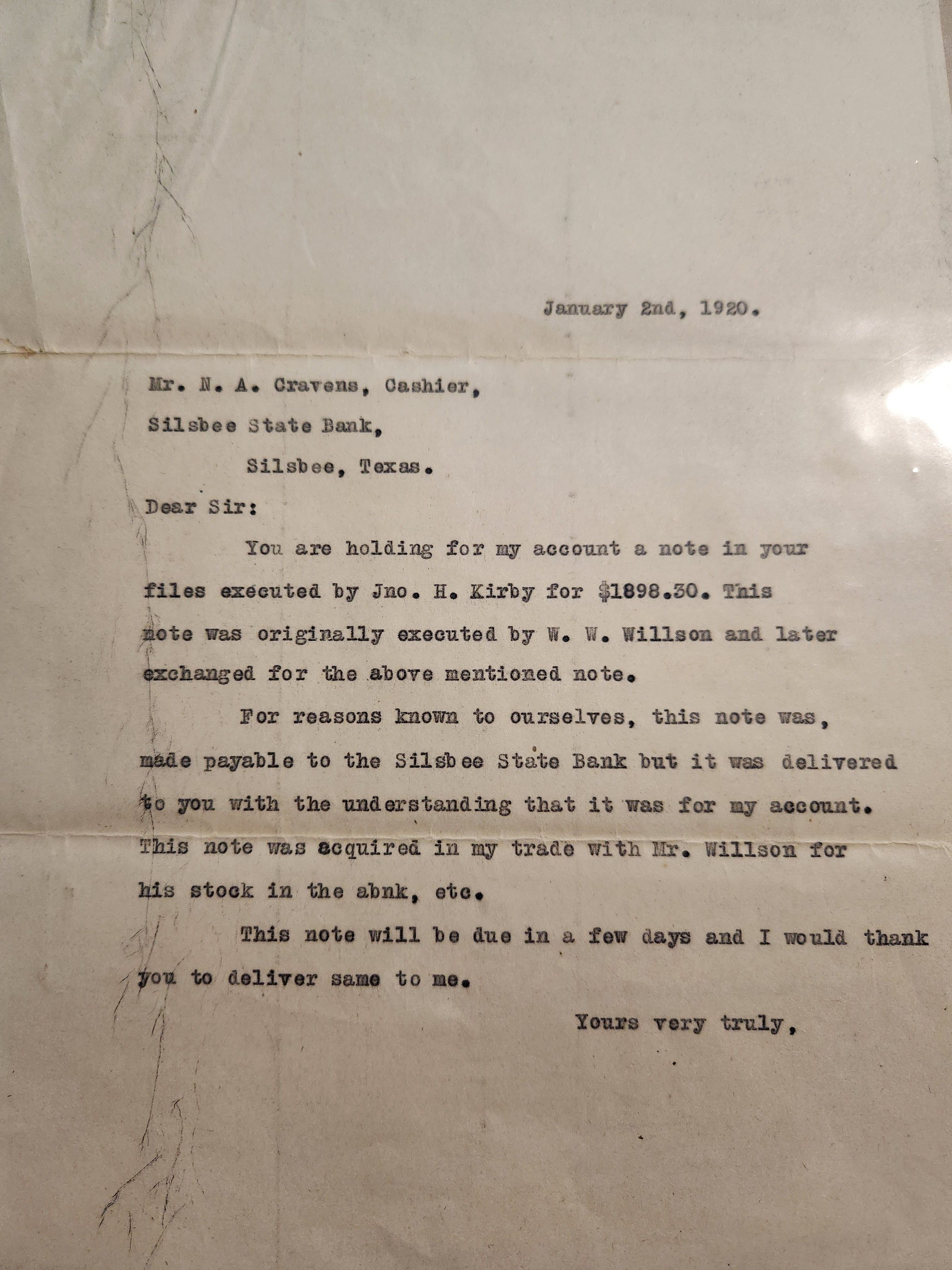 Letter to N A Cravens, Cashier, Silsbee State Bank from R L Weathersby dated January 2, 1920 concerning John Henry Kirby note for $1898.30Tags