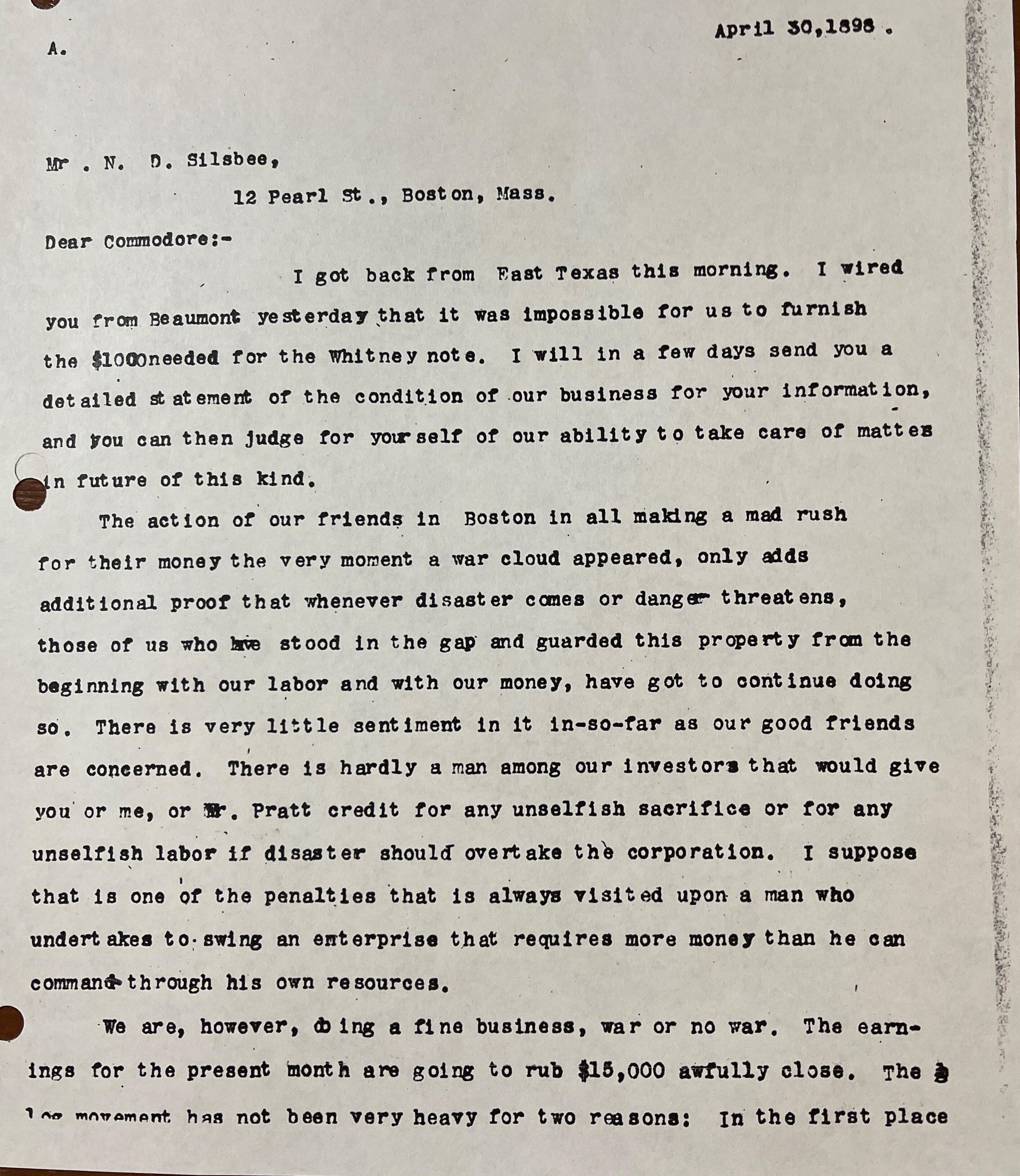 Letter to Nathaniel Silsbee from John H Kirby April 30, 1898 concerning Whitney NoteTags