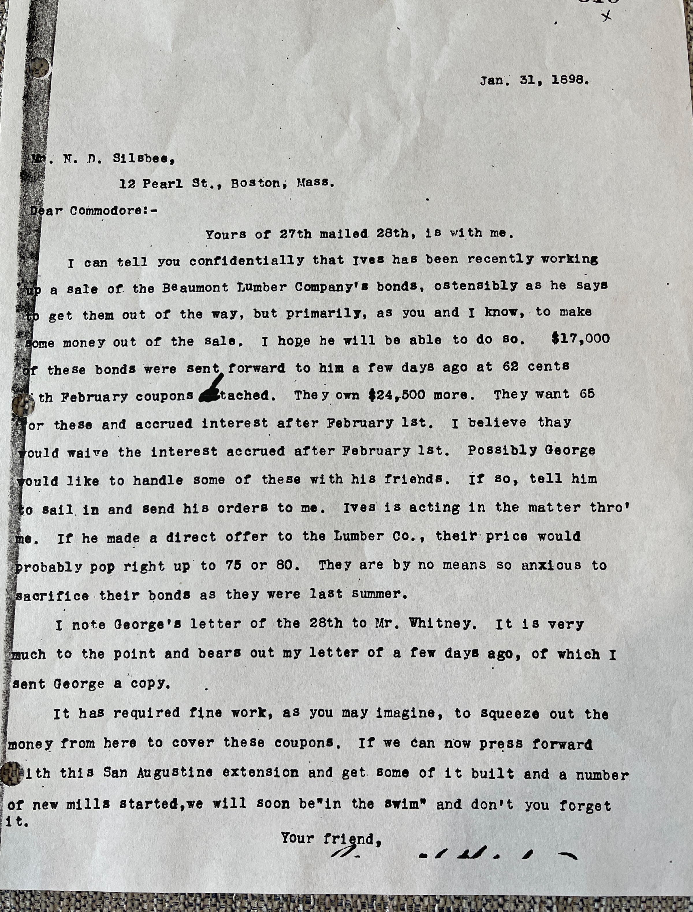 Letter in regards to the sale of Beaumont Lumber Company’s bonds.Collection