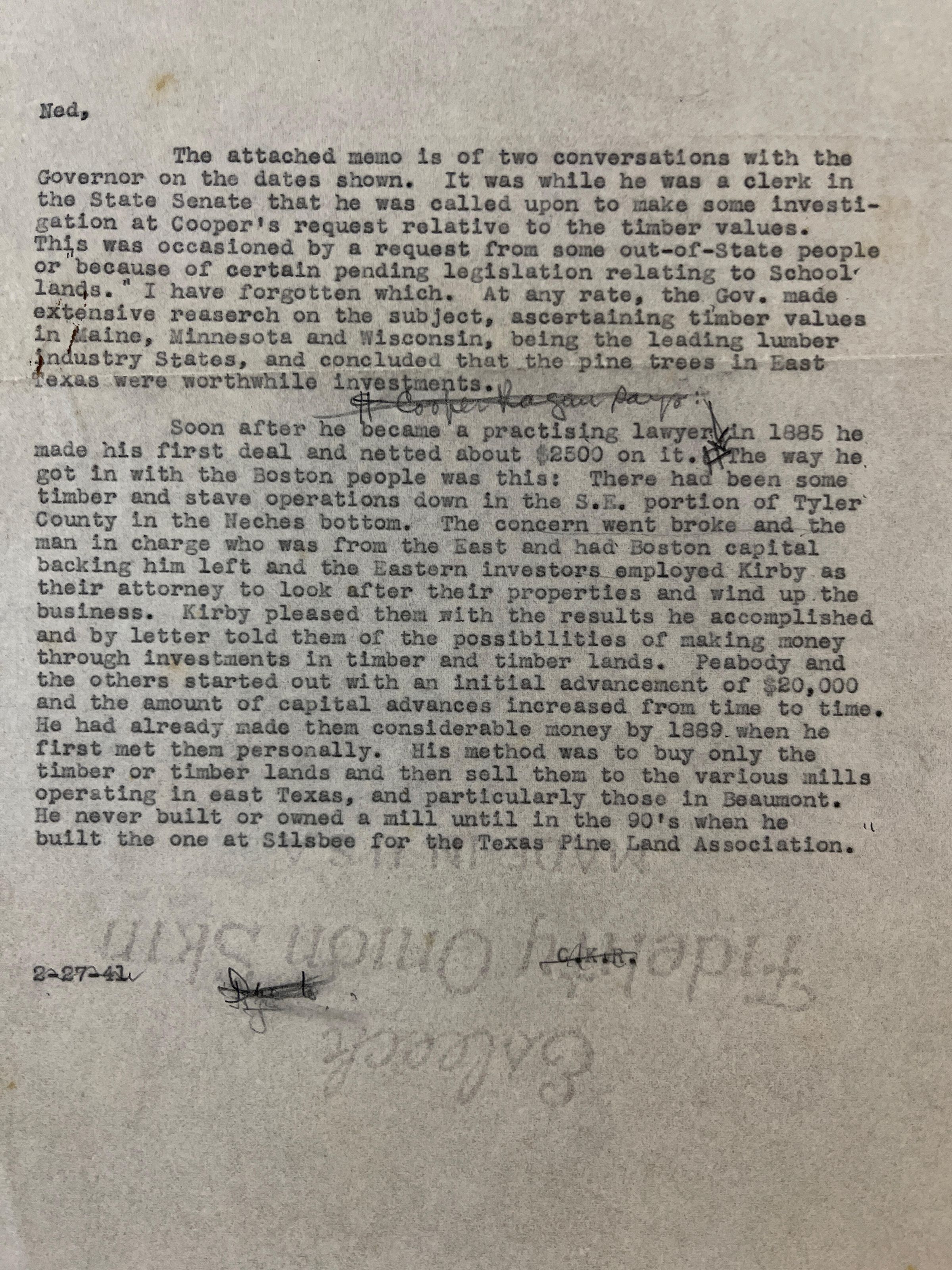 Letter to “Ned” (John H. Kirby II) about JHK from Bessie Mae dated February 27, 1941Tags