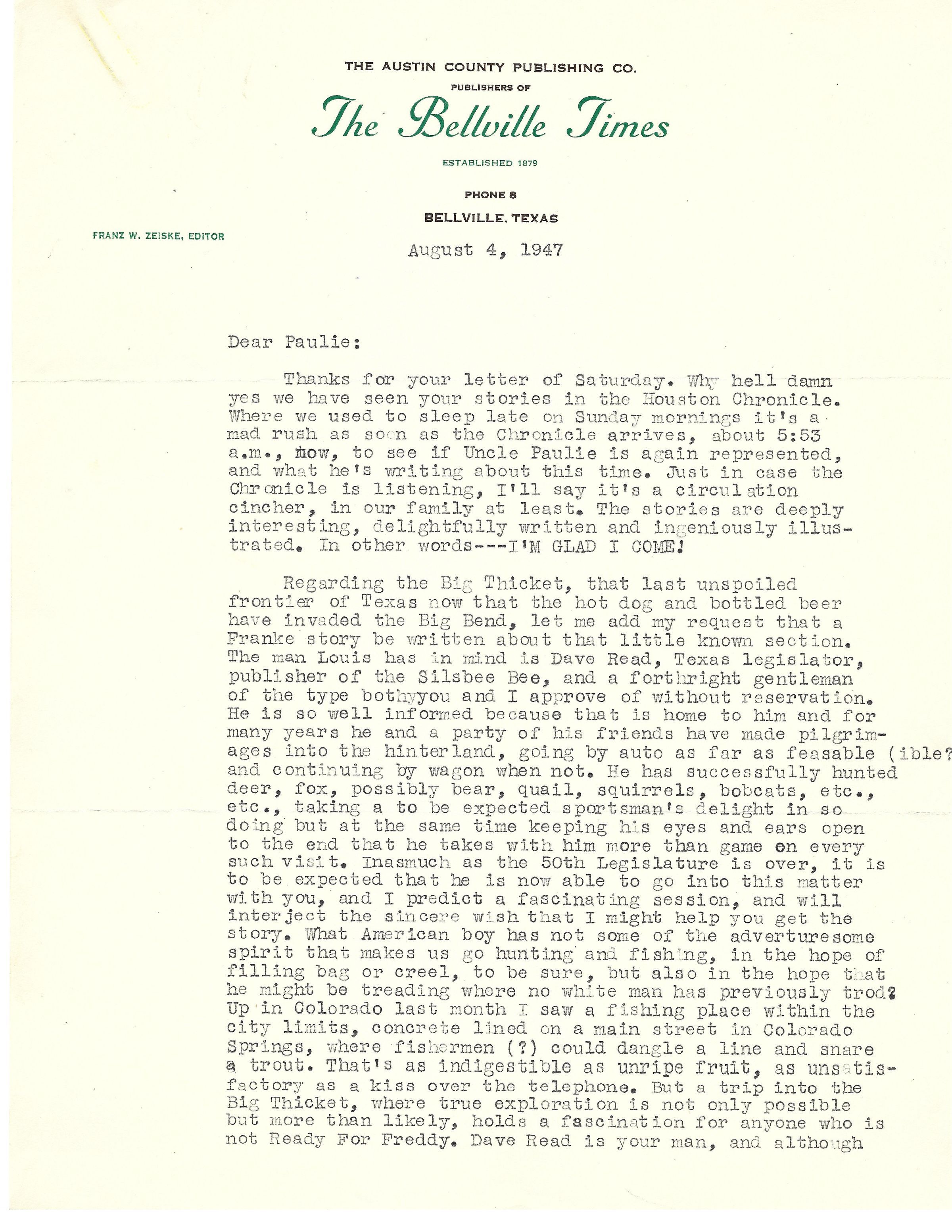 Letter to Paulie Franks from Franz Zeiske, Editor The Bellville Times August 4, 1947 - David Read MaterialsTags