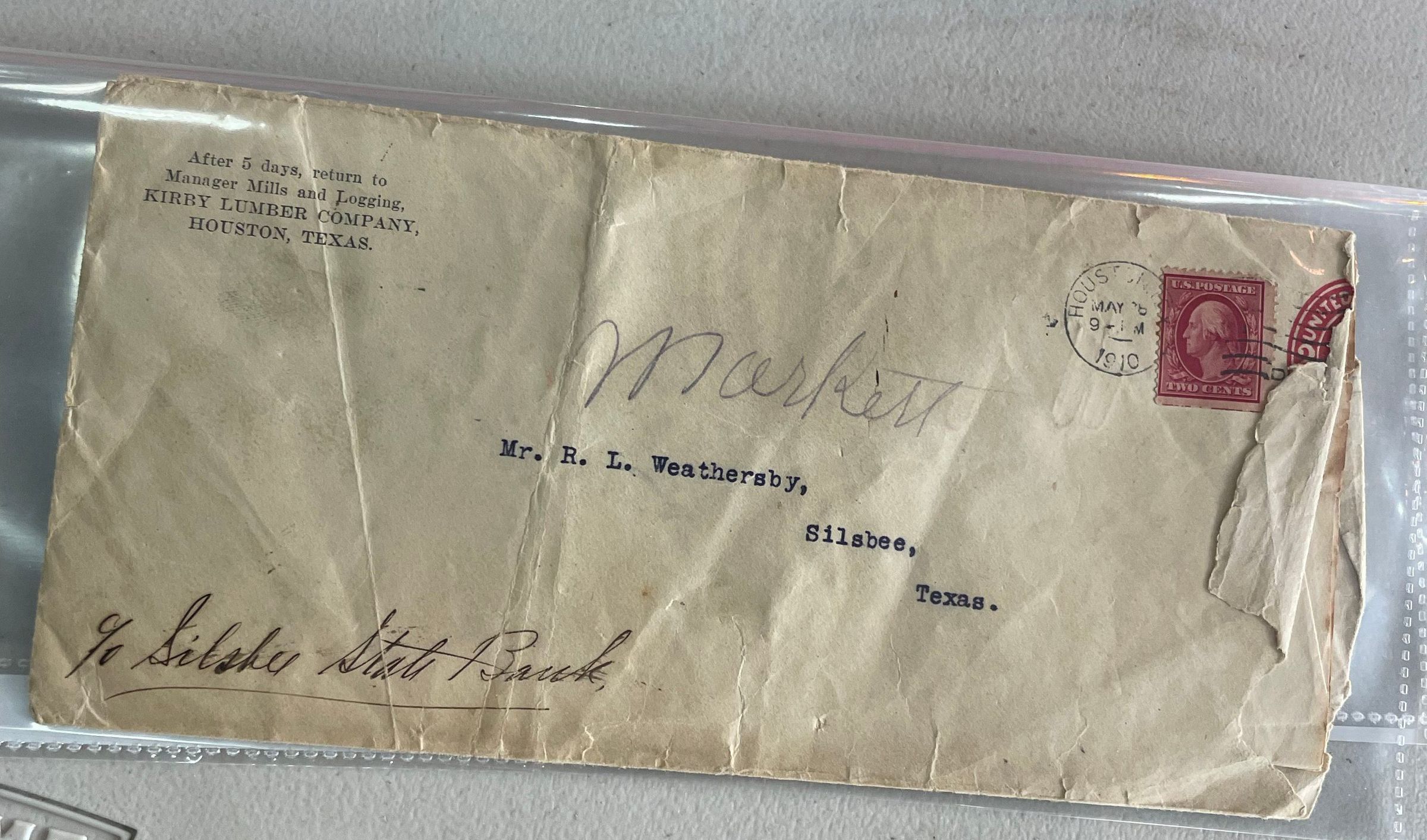 Weathersby, R L, Silsbee State Bank, Kirby Lumber and Saw Mill, Letter w/EnvelopeCreated By