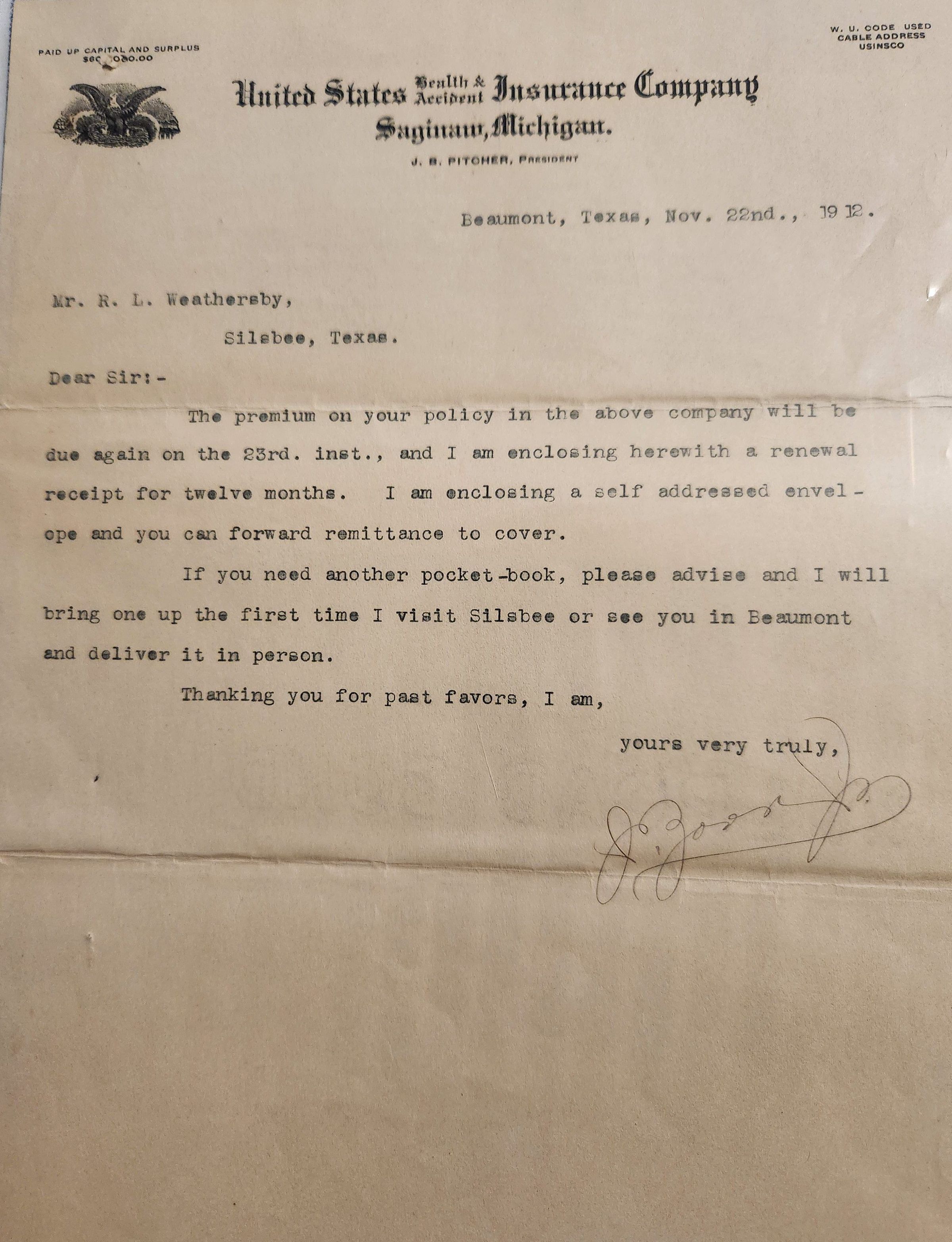 Letter to R L Weathersby from J Zorn dated November 22, 1912 concerning premium due and receiptTags