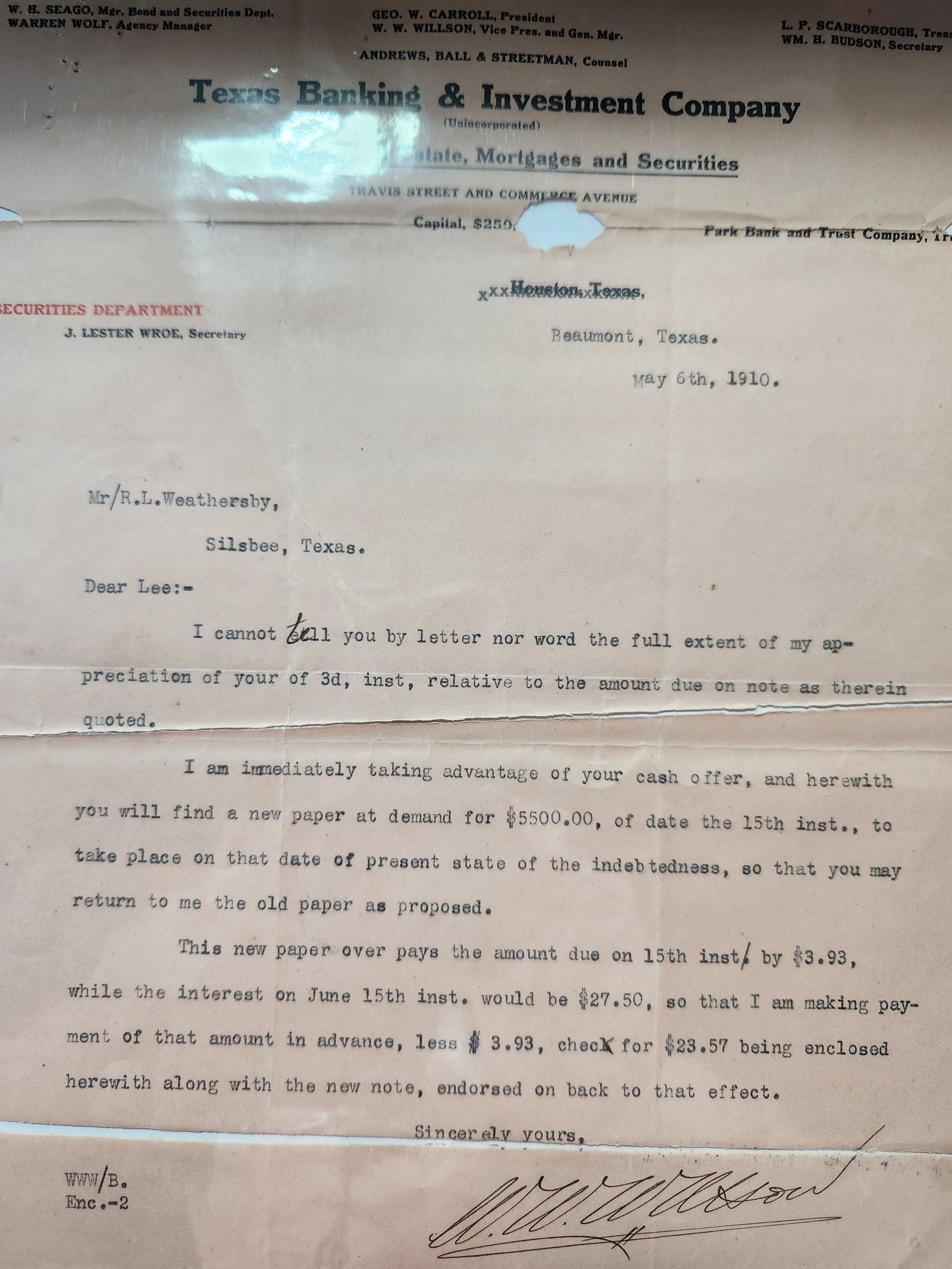 Letter to R L Weathersby from W W Wilson dated May 6, 1910 concerning Loan notes and interestTags