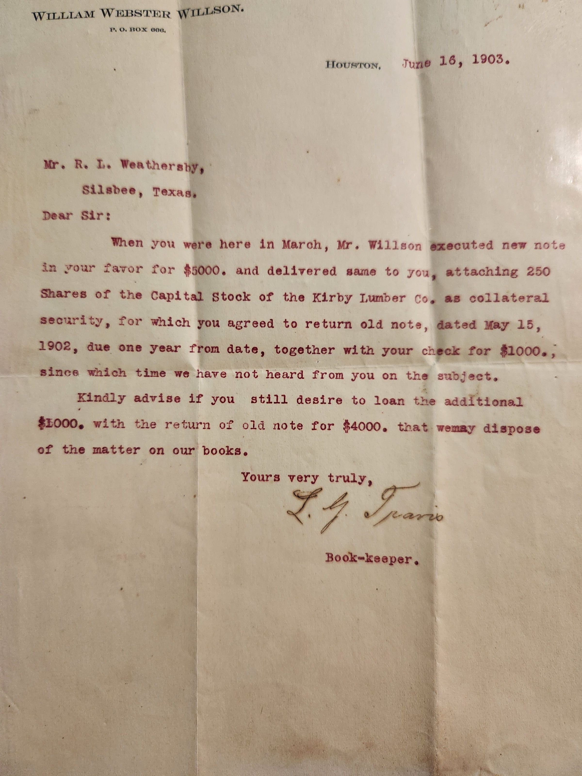 Letter to R L Weathersby from William Webster Willson dated June 16, 1903 concerning Capital Stock of Kirby Lumber Co $1000 LoanTags