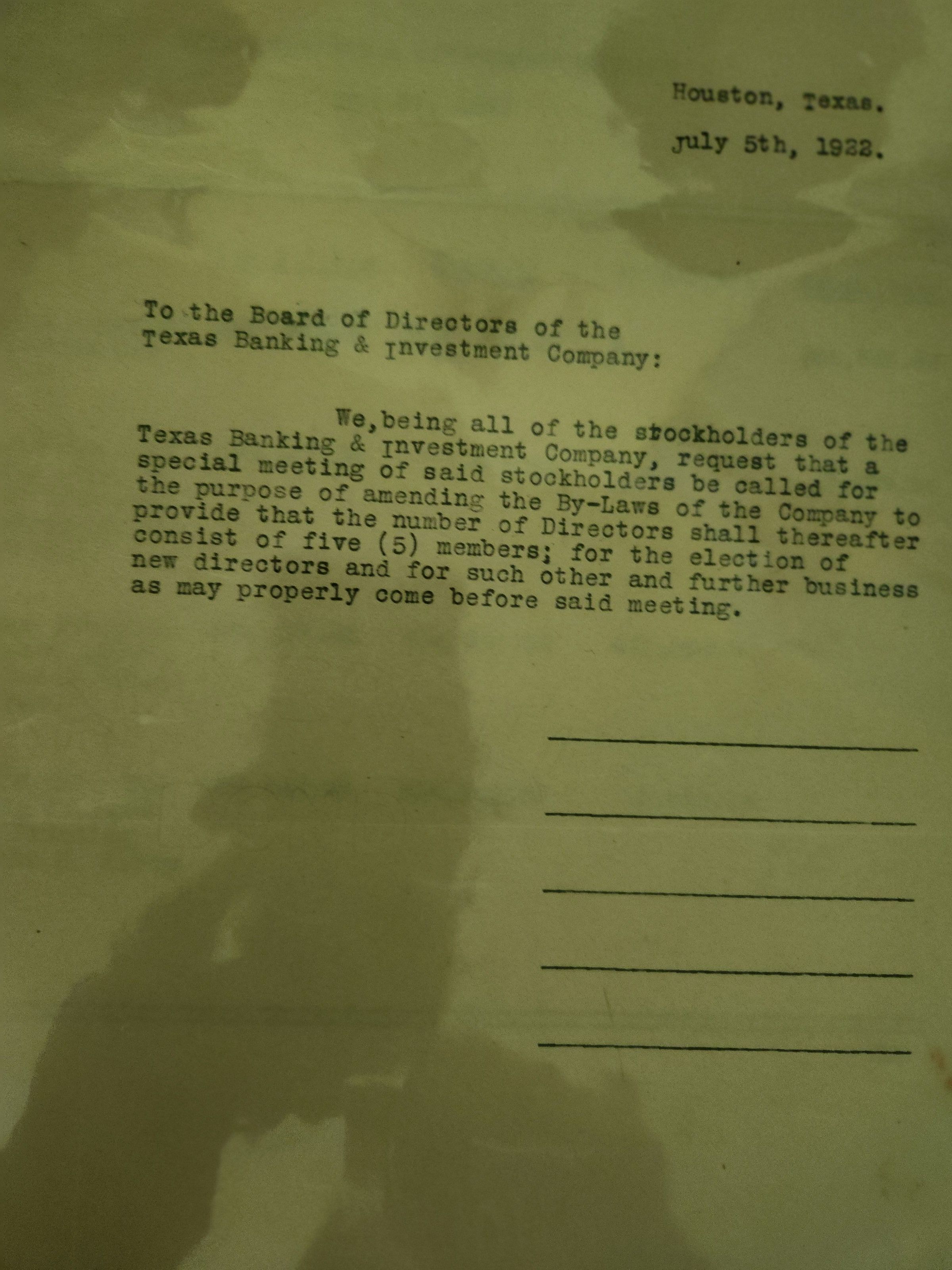 Letter to the Board of Directors of Texas Banking & Investment Co dated July 5, 1922Tags
