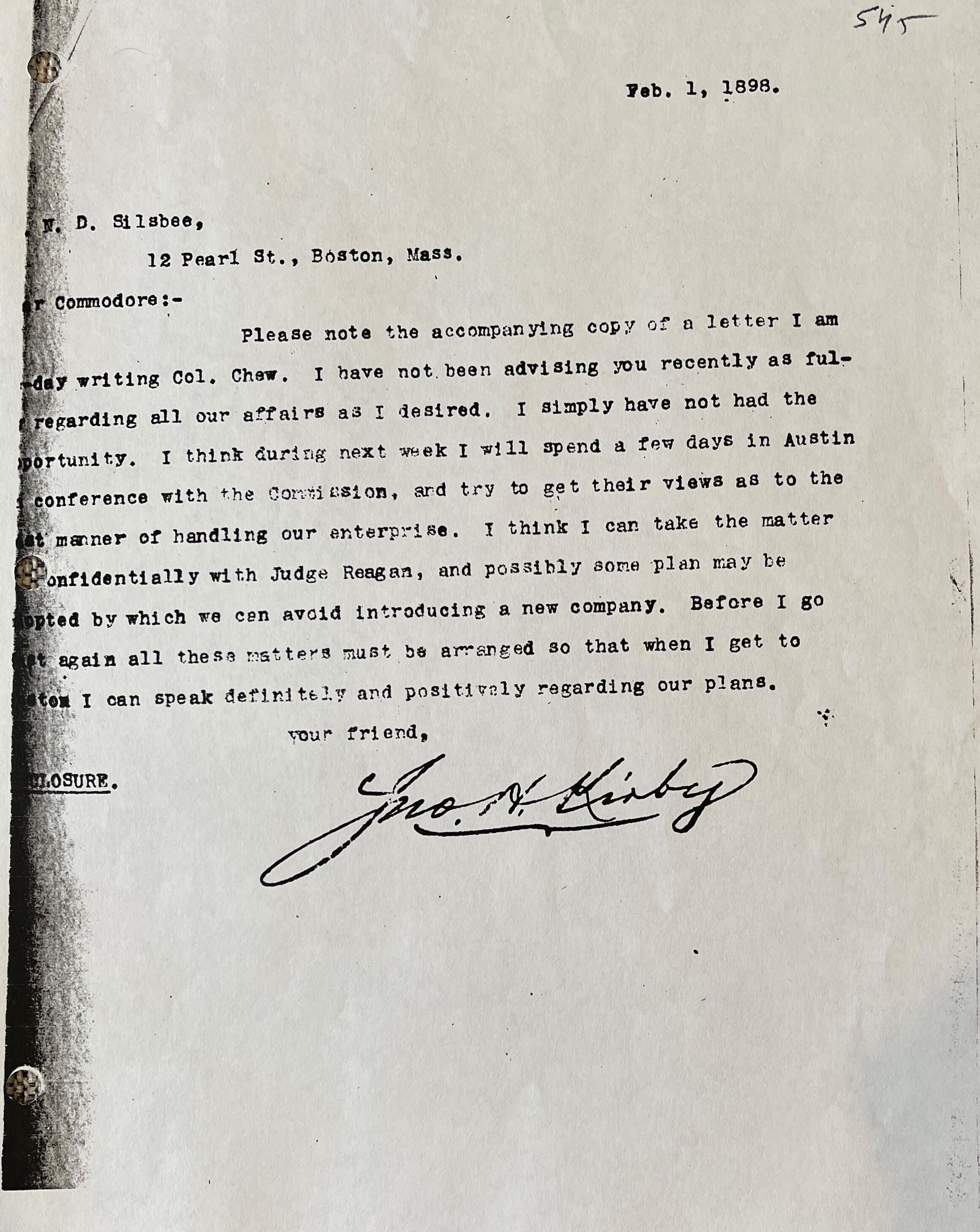 Letter explaining that JHK is planning to go to Austin to speak with the Commission about the handling of their enterprise.Cataloged By