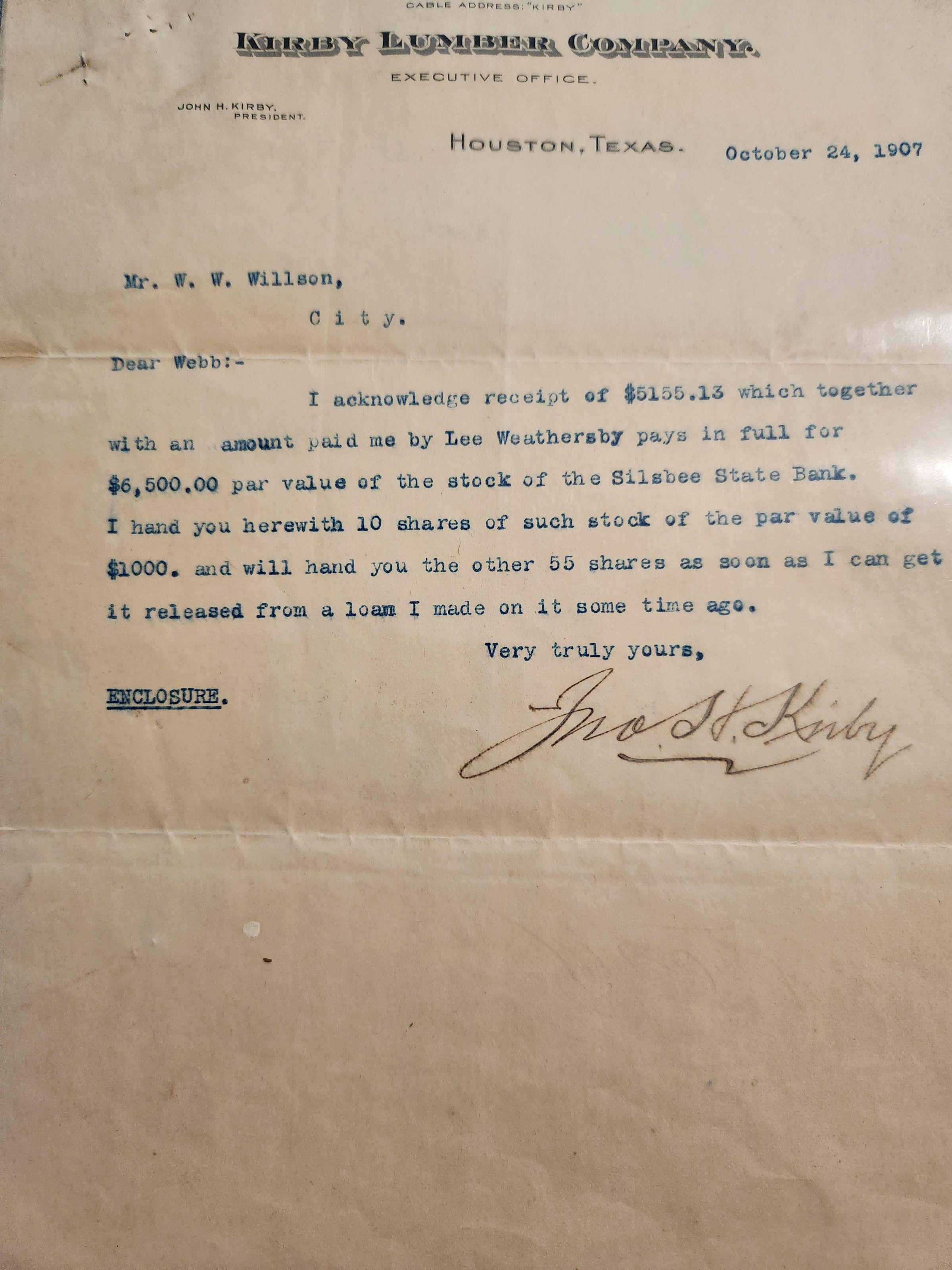 Letter to W W Wilson from John H Kirby dated October 24, 1907 concerning receipt of funds for Silsbee State Bank StockTags