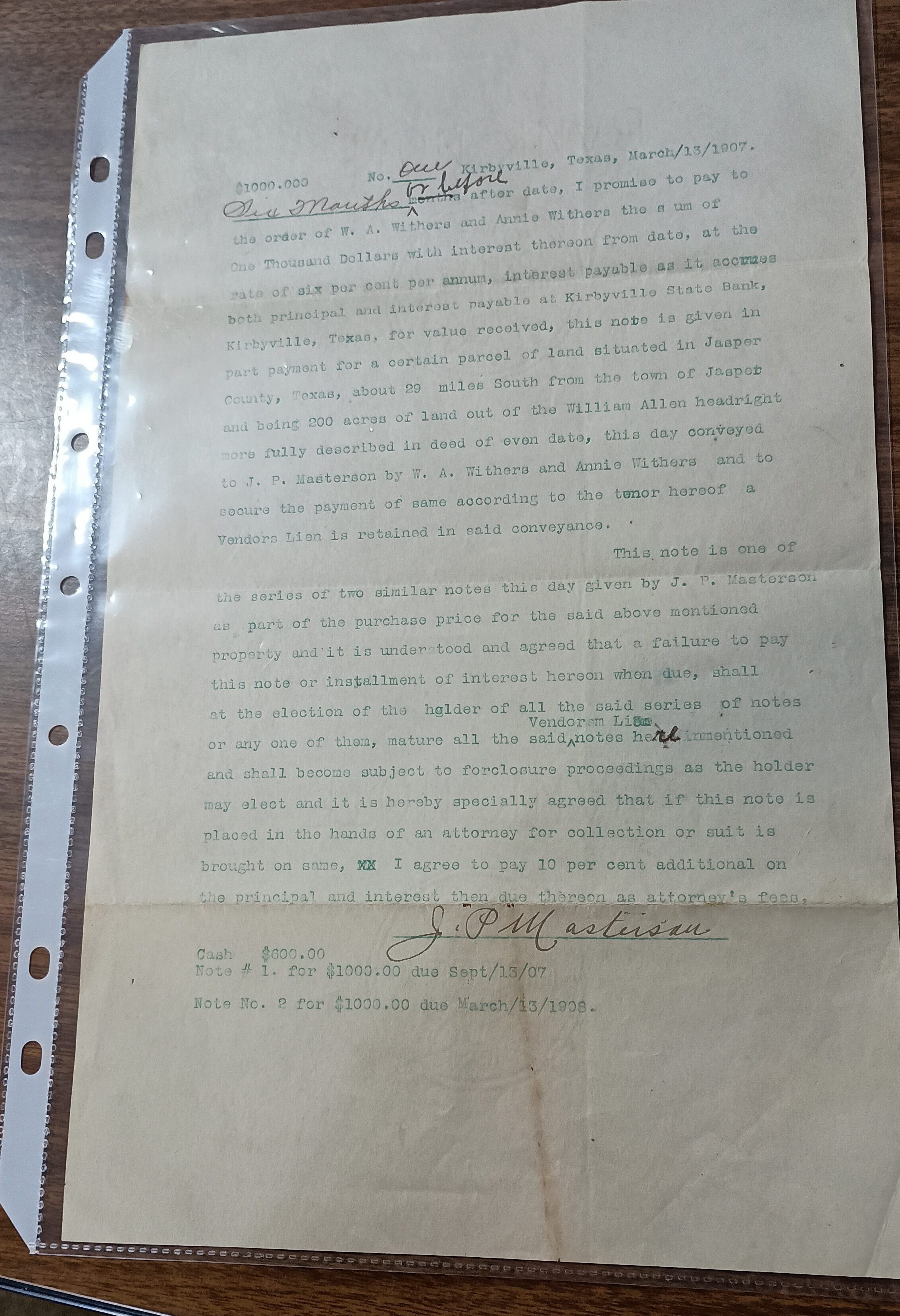 Loan Note 1 dated March 13, 1907 for $1000 payable to W.A. Withers for a parcel of land signed by J.P. MastersonTags