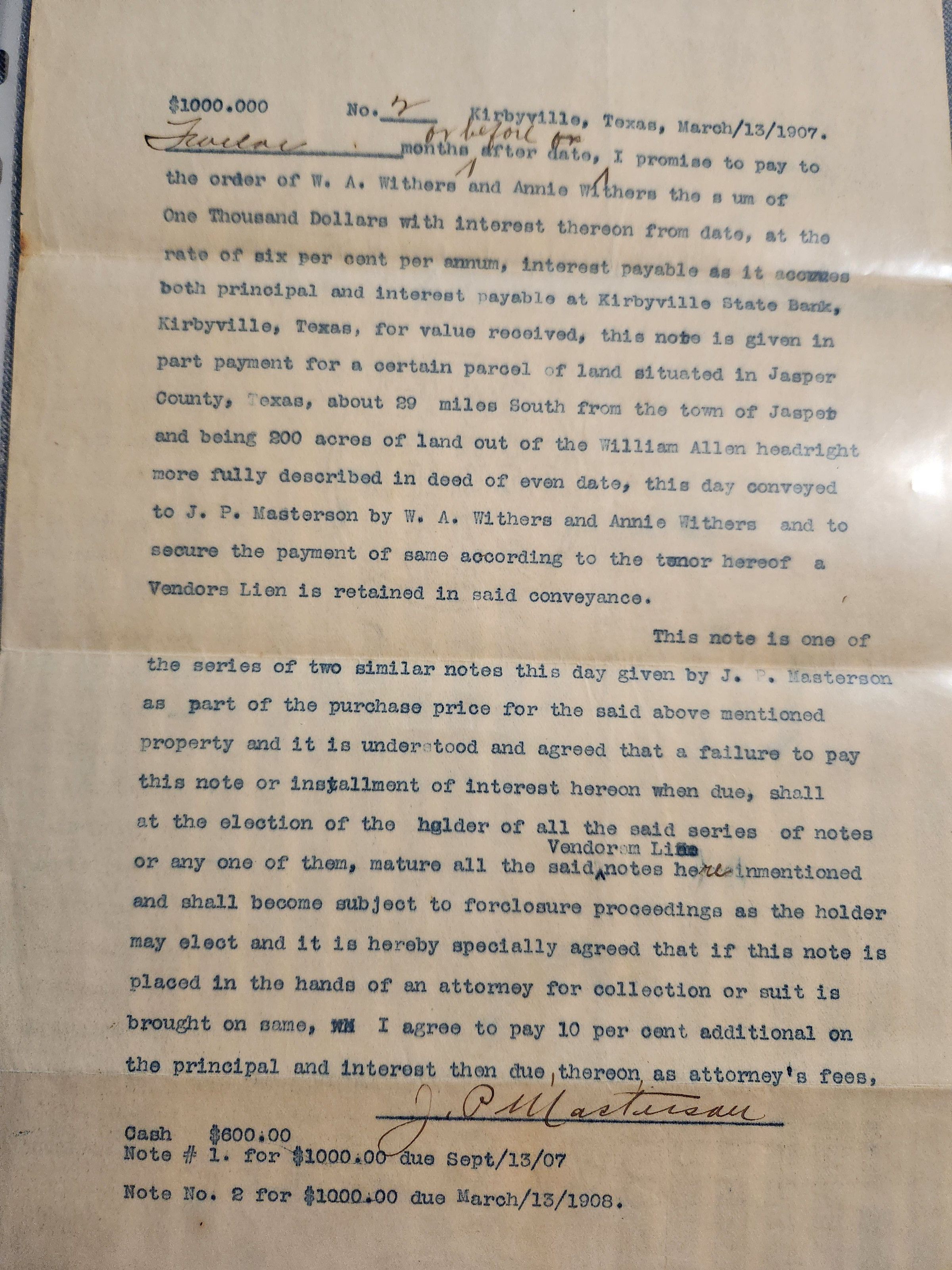 Loan Note 2 for $1000 dated March 13, 1907 payable to Withers at Kirbyville State BankTags