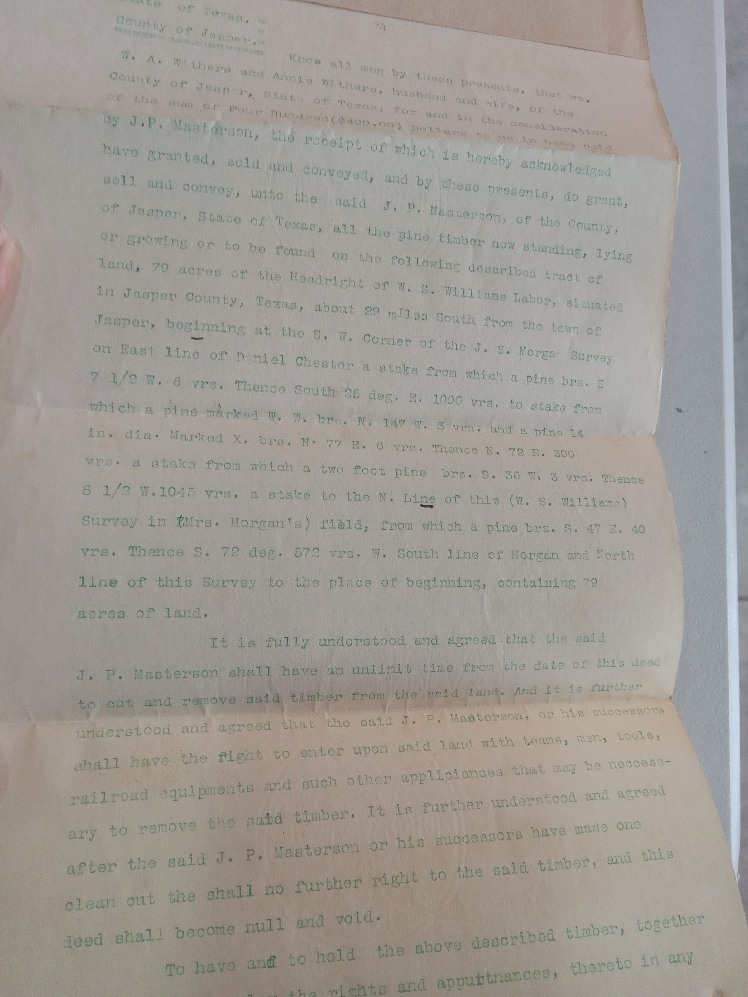 Lumber right agreement from WA Withers and Annie Withers Top Masterson Date March 1909Tags