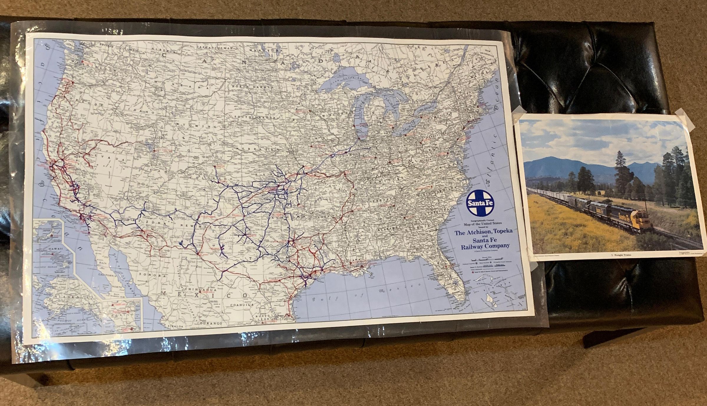 A US Map issued by The Atchison, Topeka, and Santa Fe Railway Company showing the Santa Fe System. It includes a picture of a Santa Fe Freight Train rolling down the tracks through a field of yellow flowers, pine trees, and a mountain range in the background.Collection