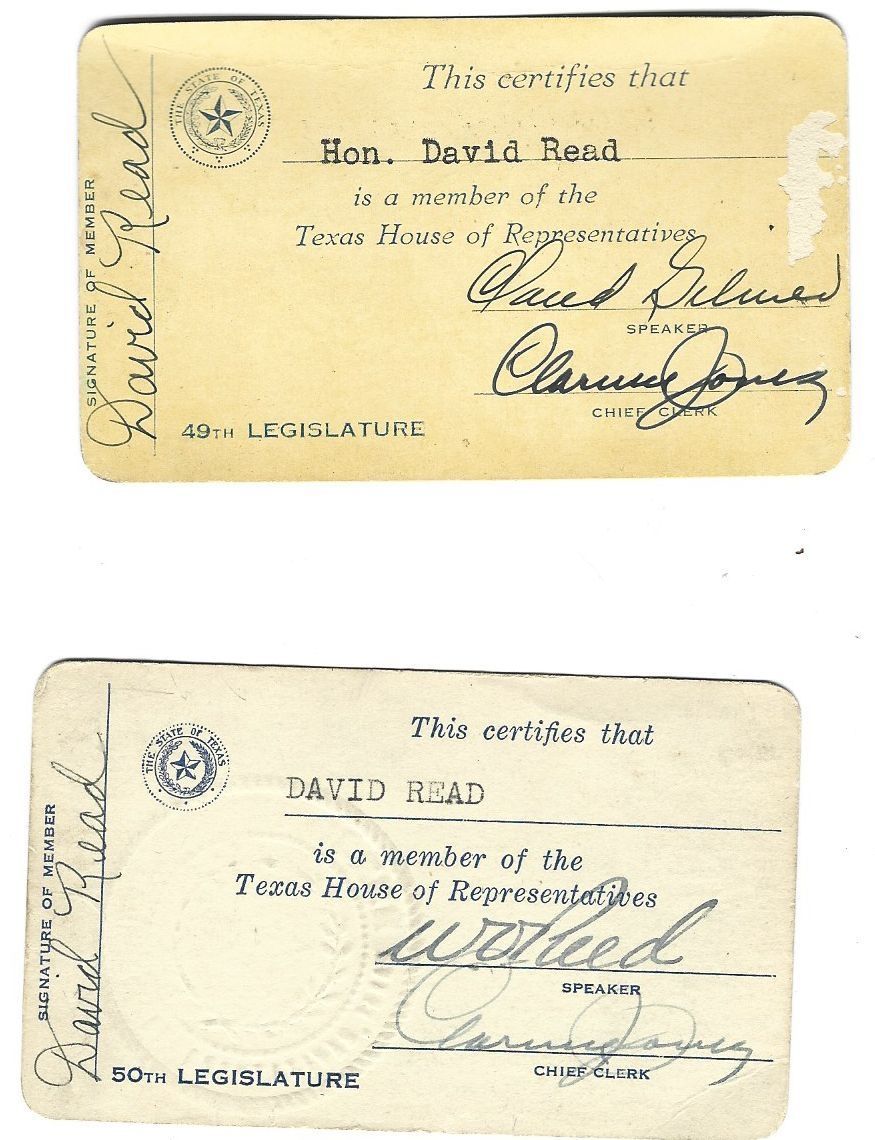 Membership Cards for David Read Certifing Member of the Texas House of Representatives 49th Legislature and 50th LegislatureTags