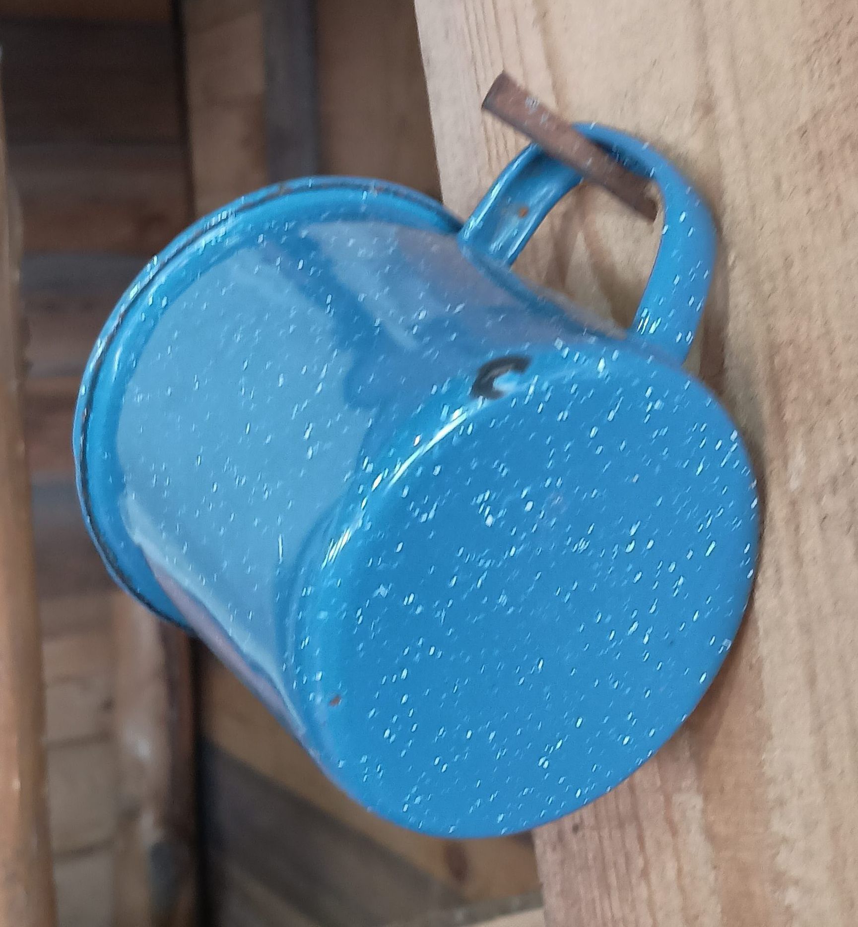 Metal Enamel Cup: Blue with white specks - chip on bottom/side