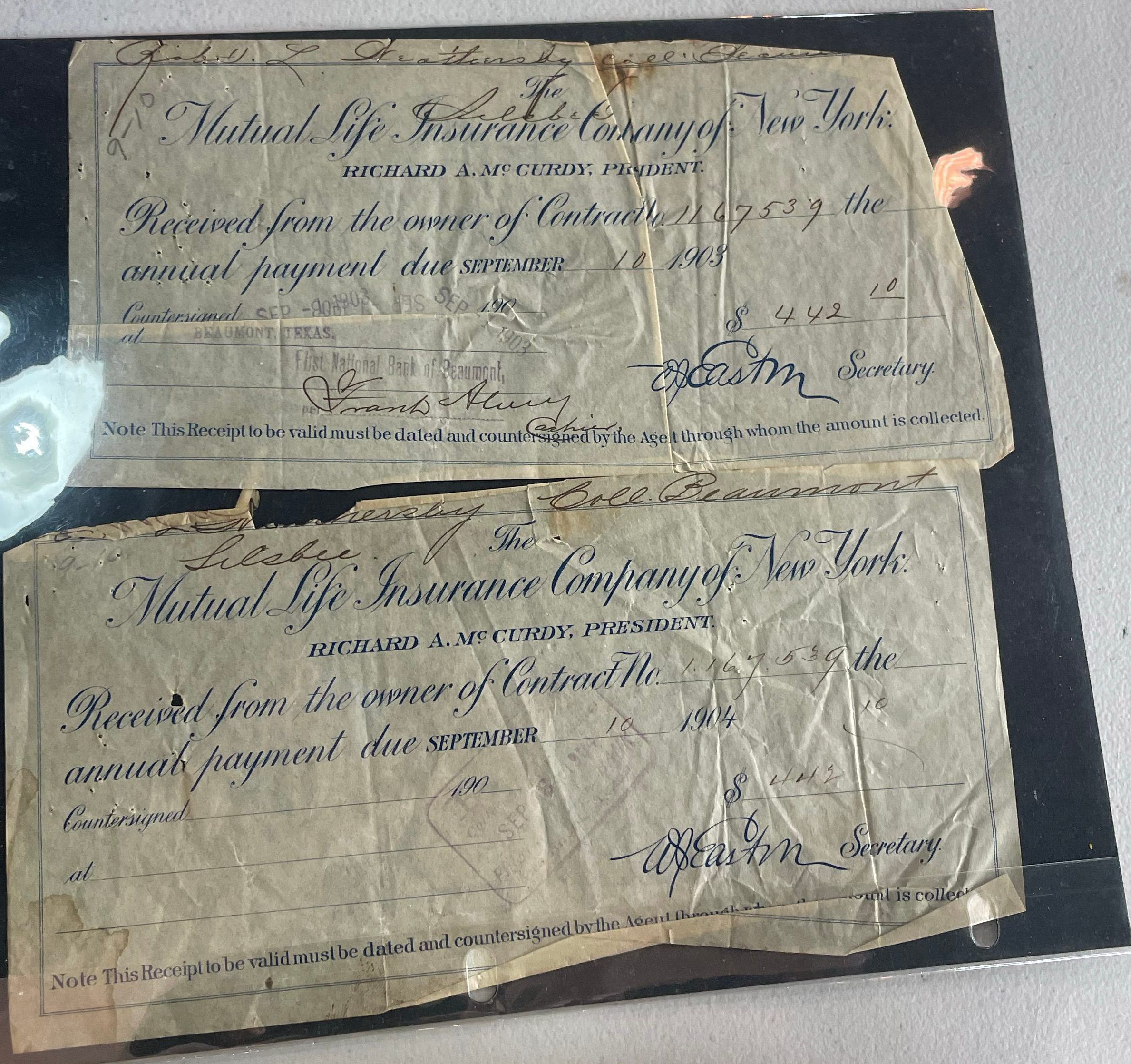 Mutual Life Insurance Company of New York receipts for premium payments September 1903 - September 1904Tags