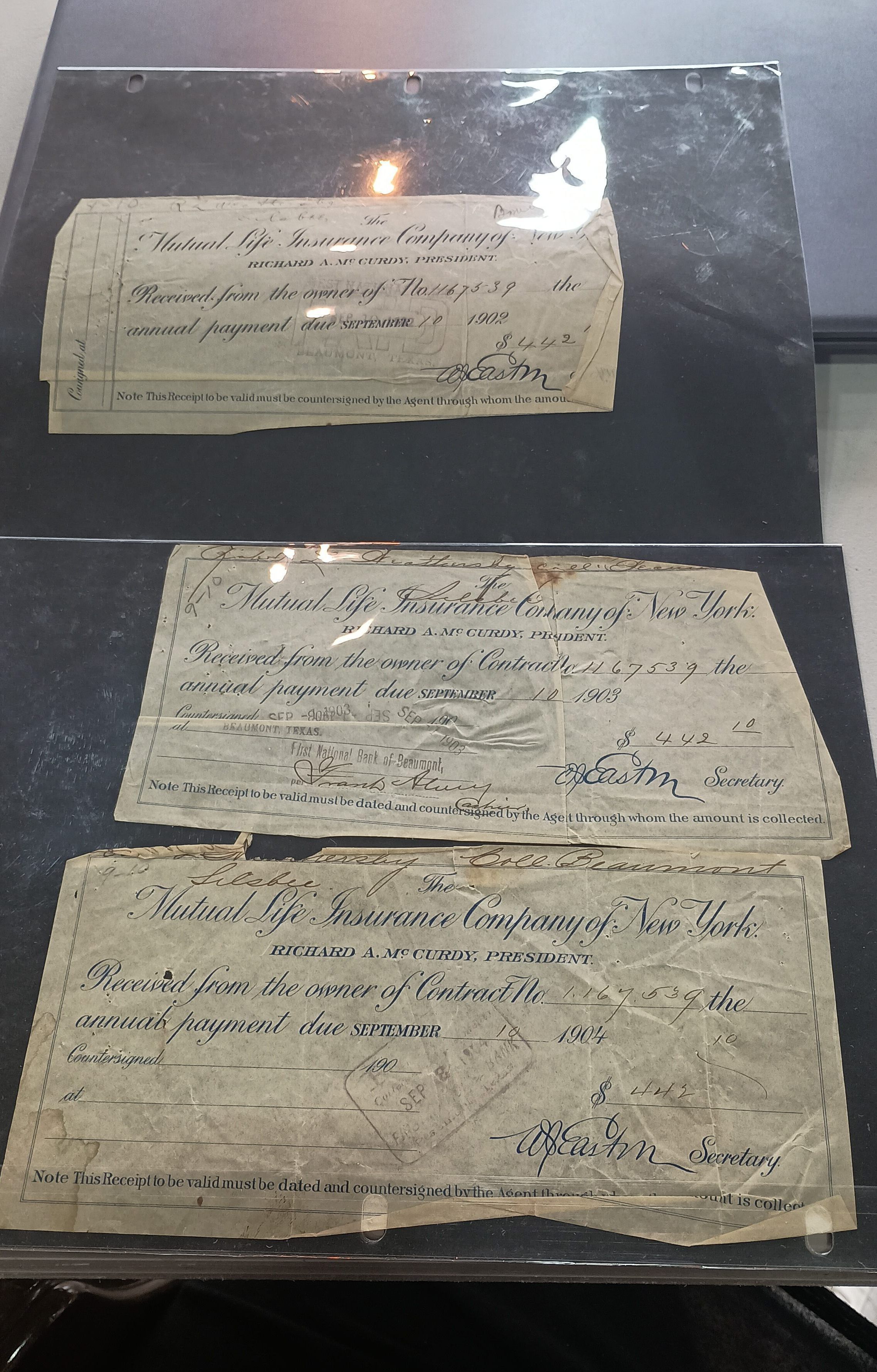 Mutual Life Insurance Company receipts for R.L. Weathersby