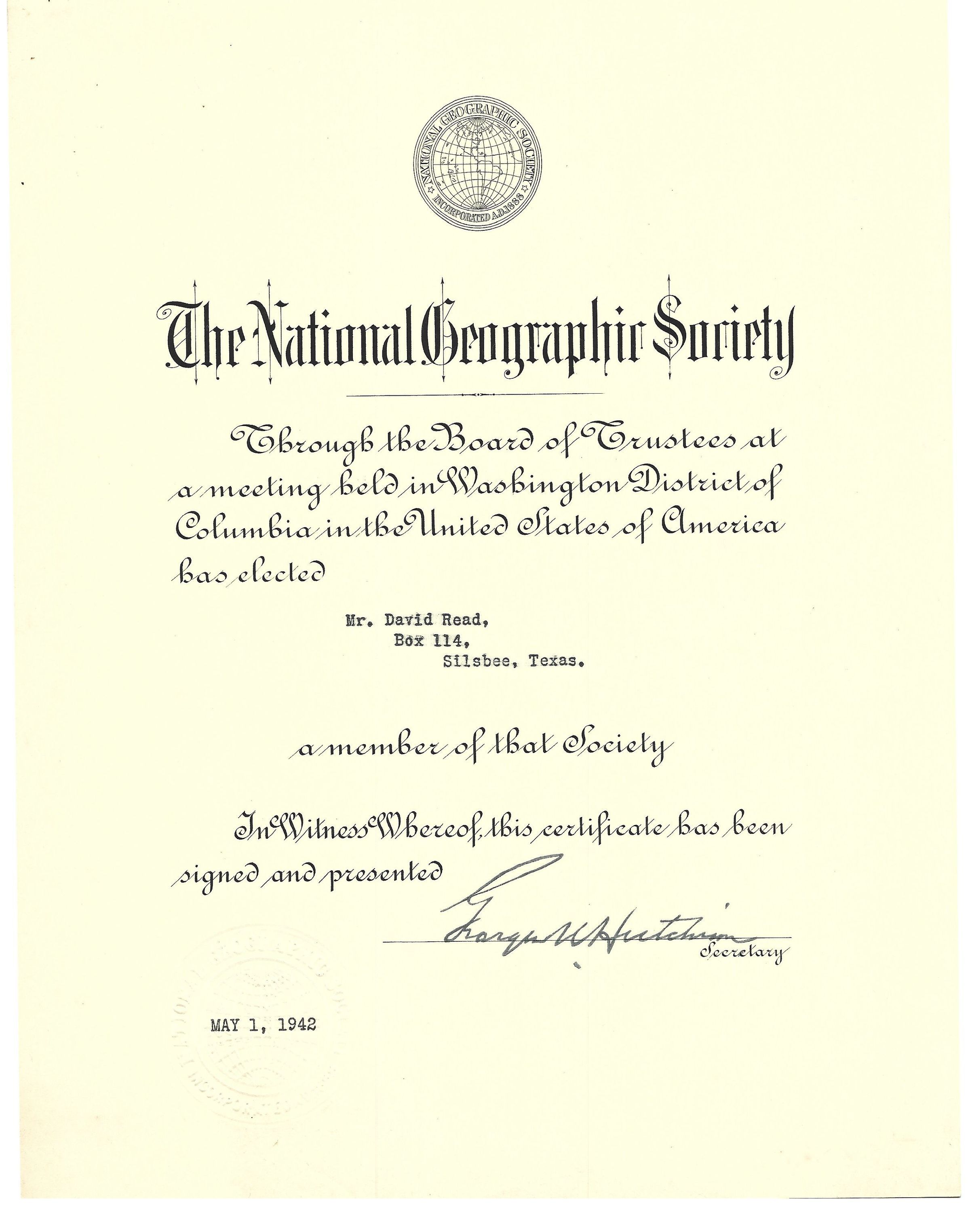 National Geographic Society Membership Certificate - David Read May 1, 1942Tags