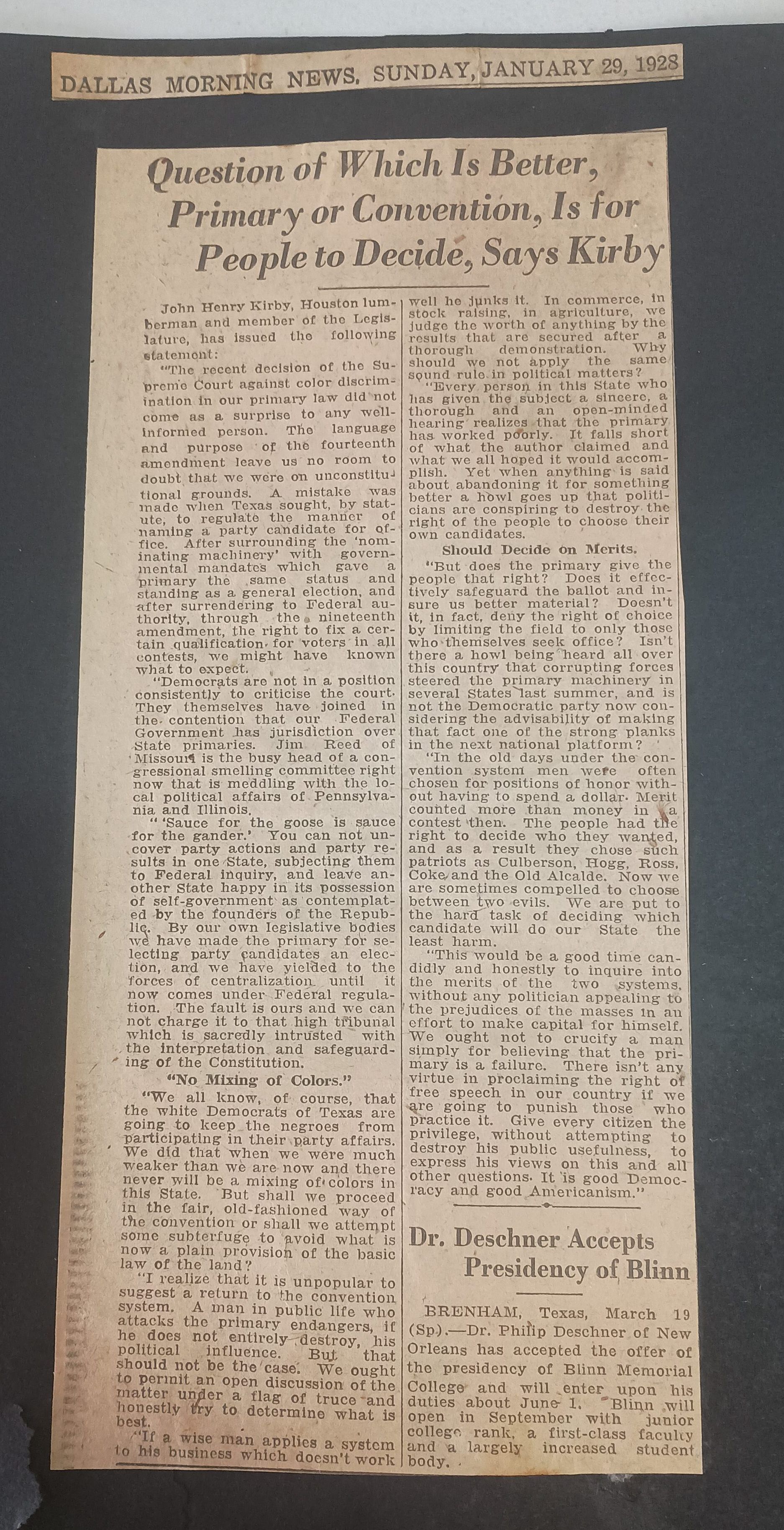 Newspaper article from the Dallas Morning News dated Sunday, January 29, 1928 about "Question of which is better, Primary or Convention" per KirbyTags
