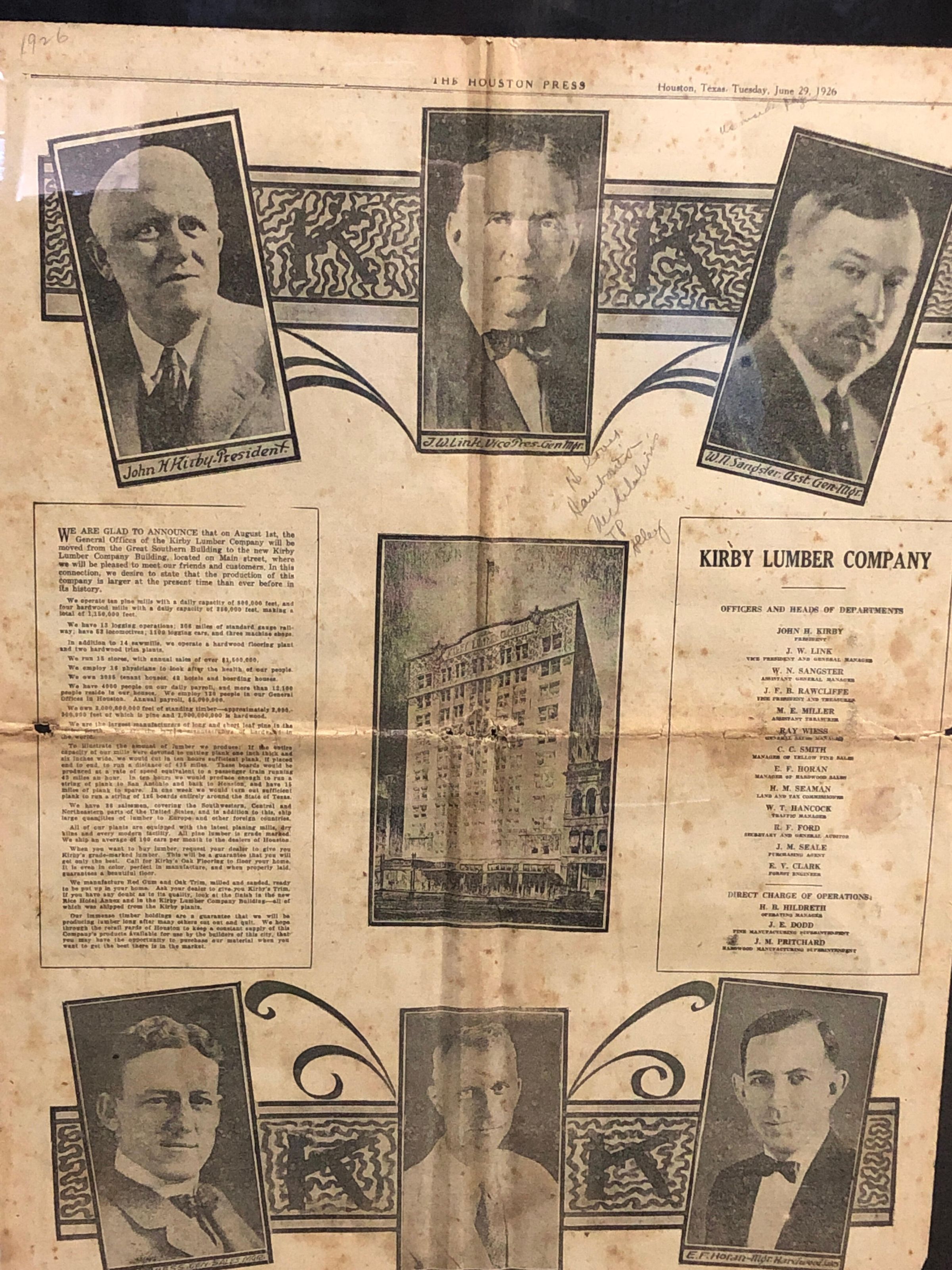 From The Houston Press, Houston, TX on Tuesday, June 29, 1926 announcing the move of the Kirby offices from the Great Southern Building to the new Kirby Lumber Company Building, located on Main StreetCollection