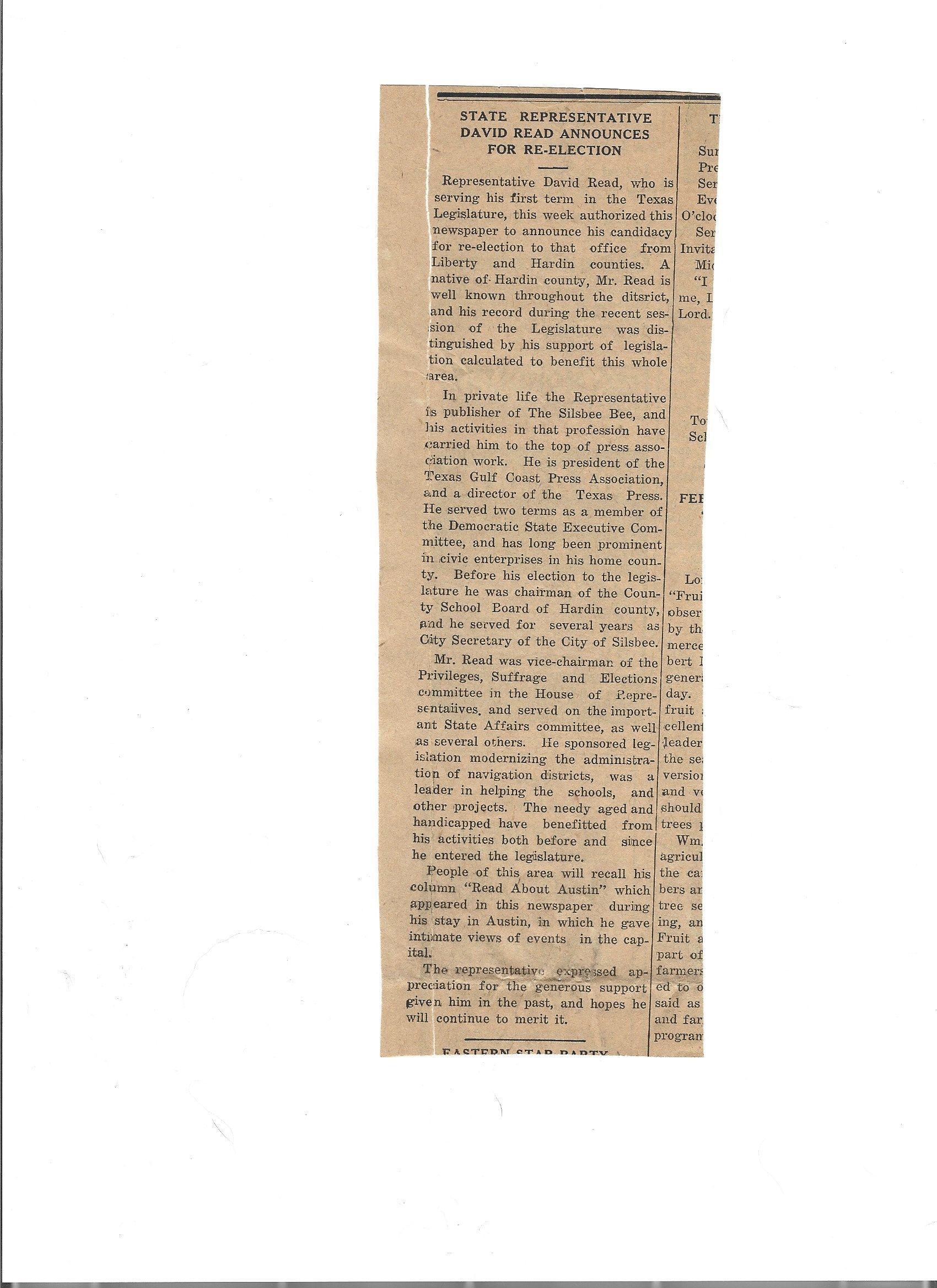 Newspaper Article "State Representative David Read Announces for Re-ElectionTags