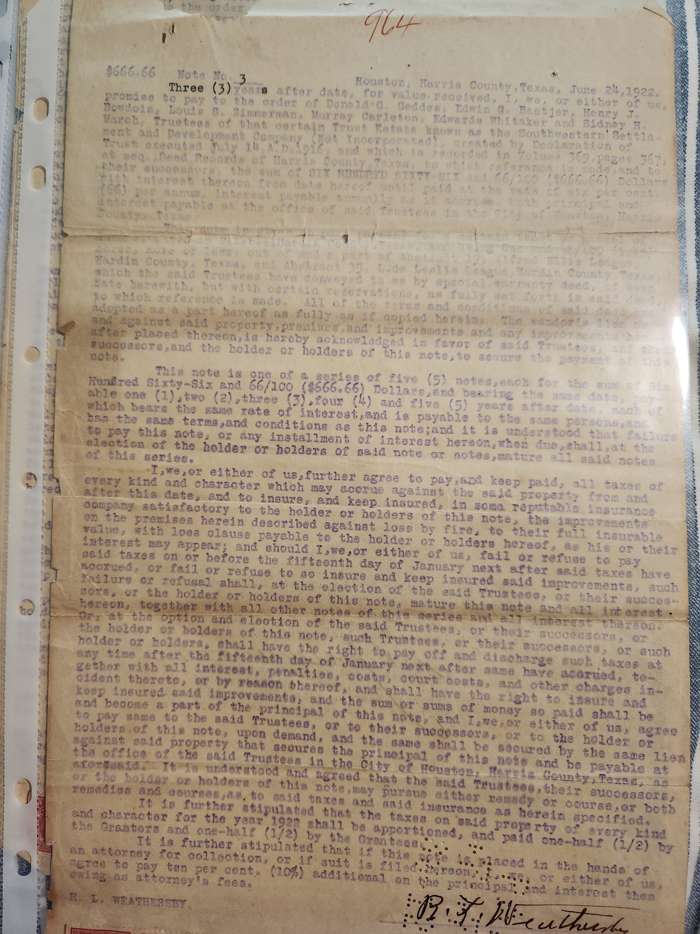Note 3 for $666.66 for Land Purchase from Southeastern Settlement and Development Company by R L Weathersby dated June 24, 1922Tags