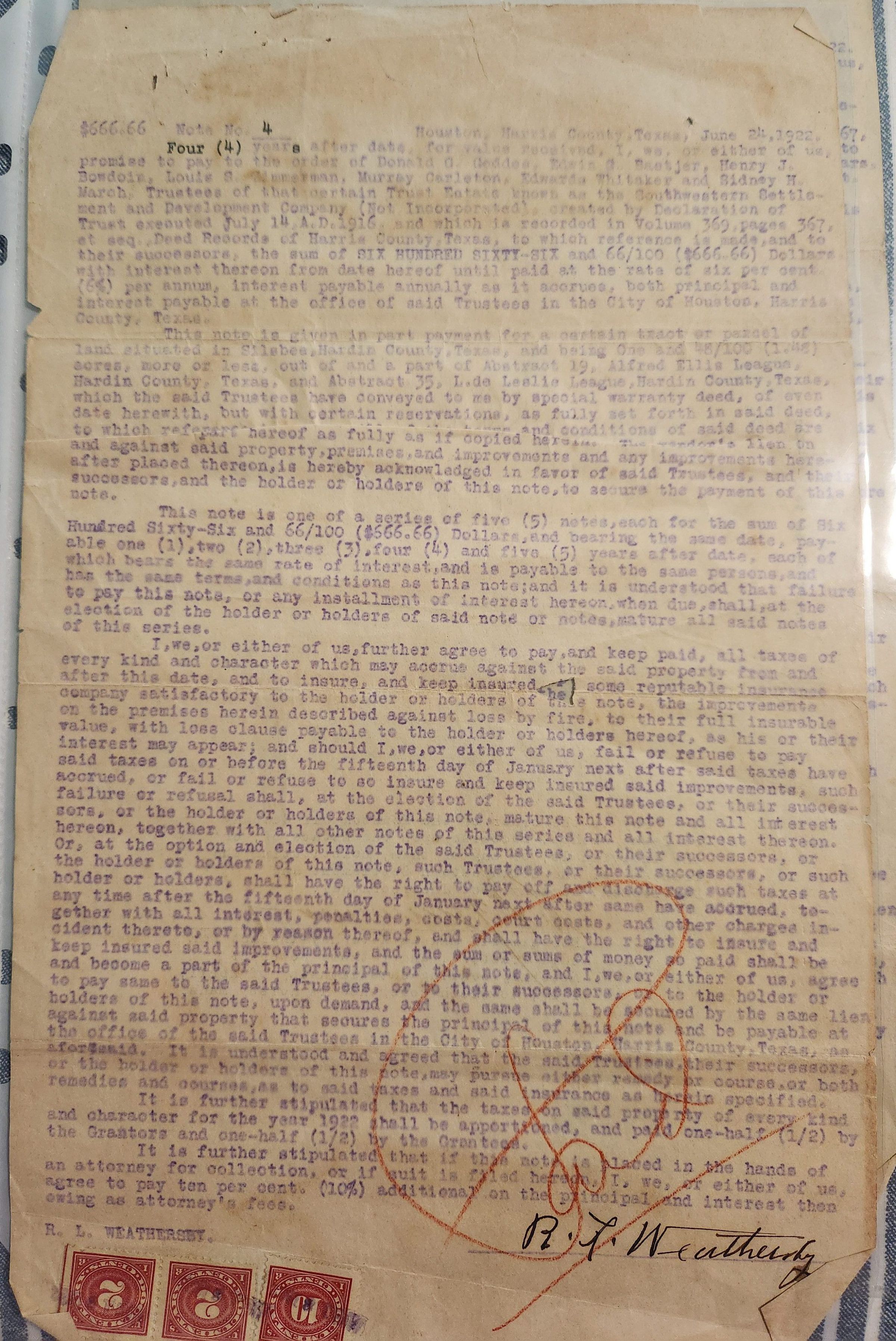 Note 4 for $666.66 for Land Purchase from Southeastern Settlement and Development Company by R L Weathersby dated June 24. 1922Tags