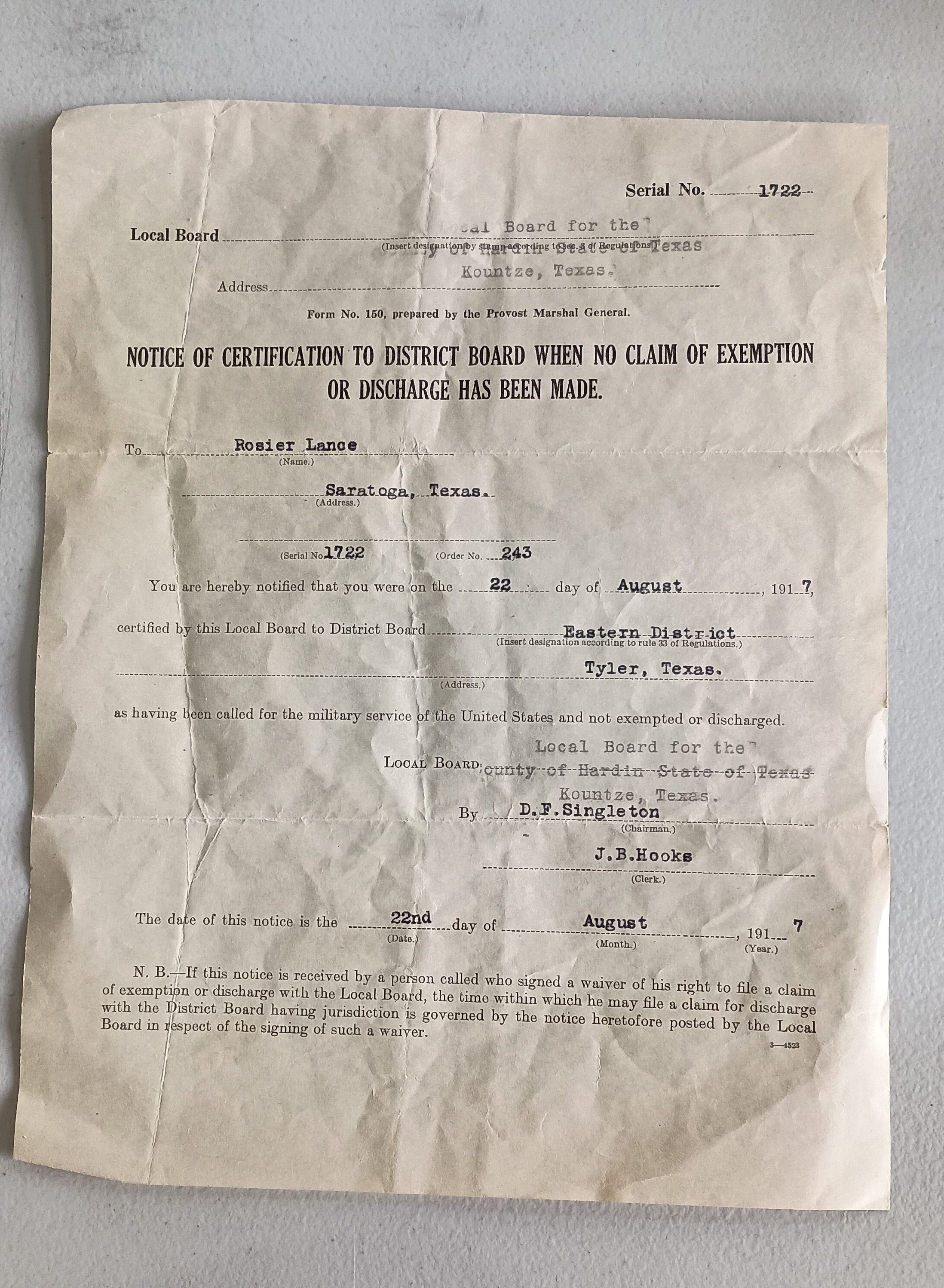 Notice of Certification to District Board for Lance Rosier dated August 22, 1917 denoting his call for military serviceTags