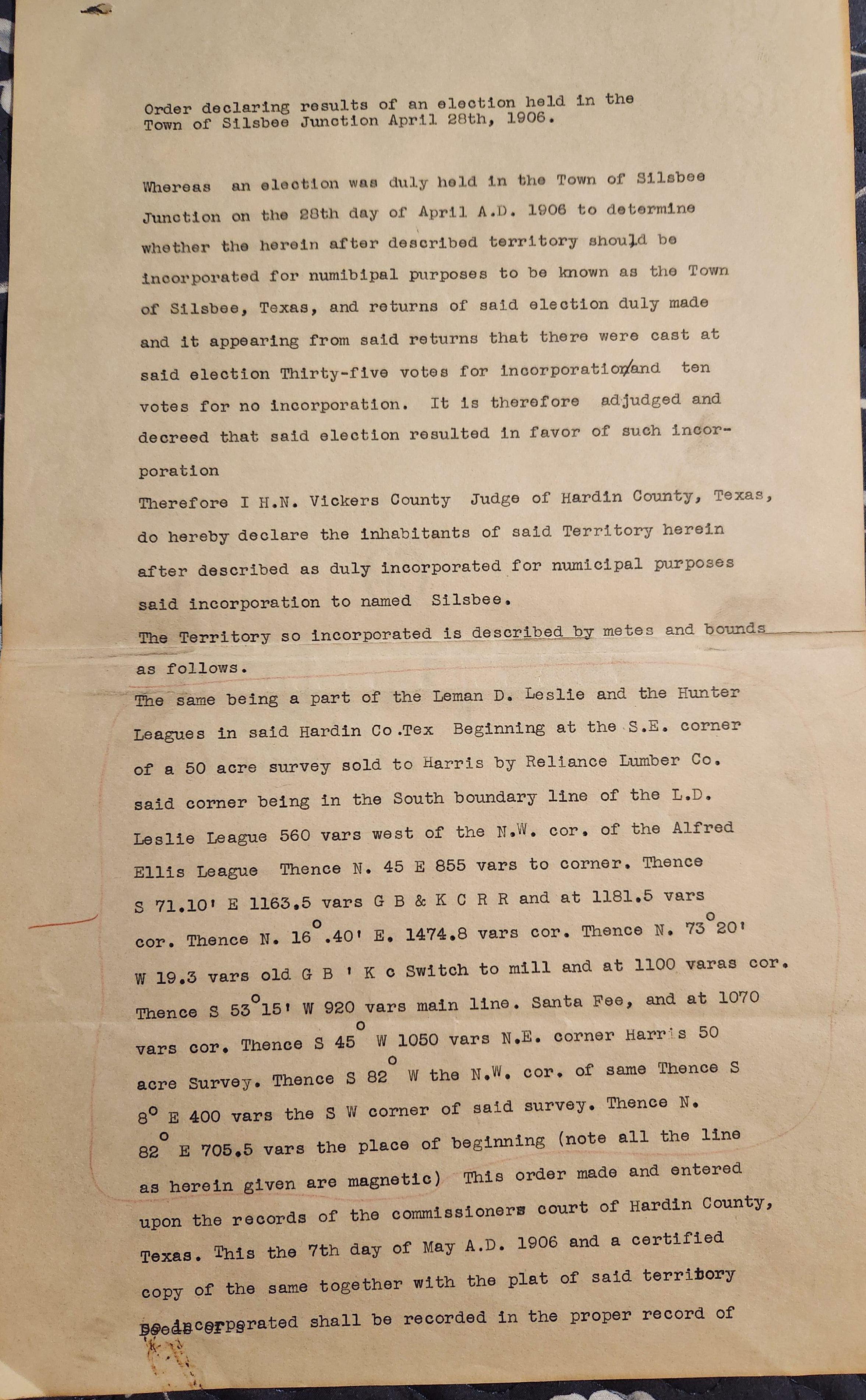 Order declaring results of an election held in the Town of Silsbee Junction April 28, 1906Tags